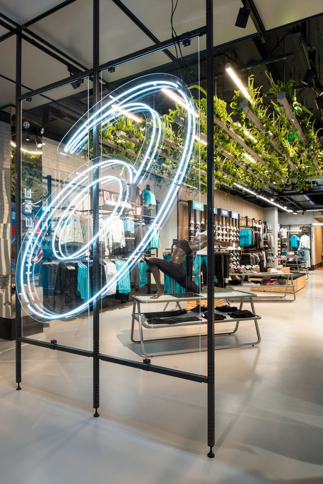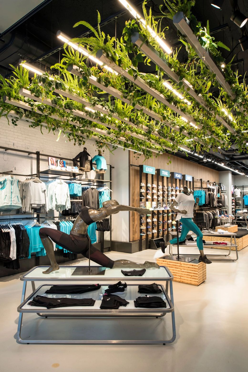 When shoppers order a particular size from a member of the team, a unique ‘robotic shoe delivery system’ kicks in. A motorised arm selects the pair from stock and delivers it back to the shop floor, while another arm in the window display catches the eye of passing customers with featured products. This technology is complemented by a touch of nature, with hydroponics potted in troughs above the store floor helping to improve air quality.