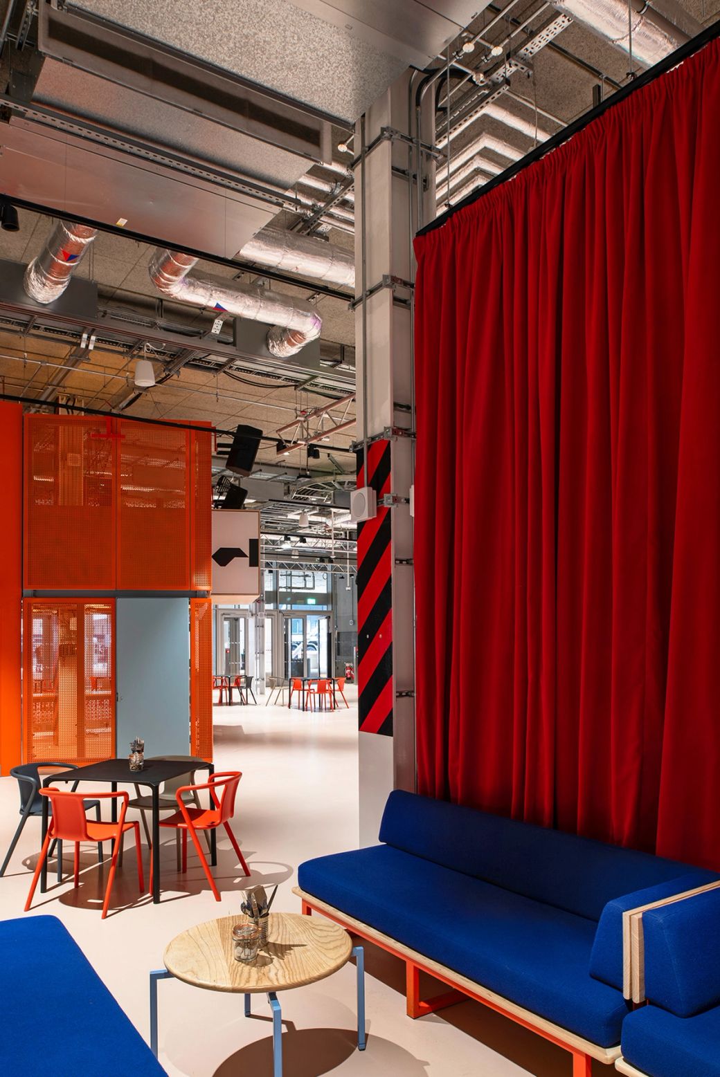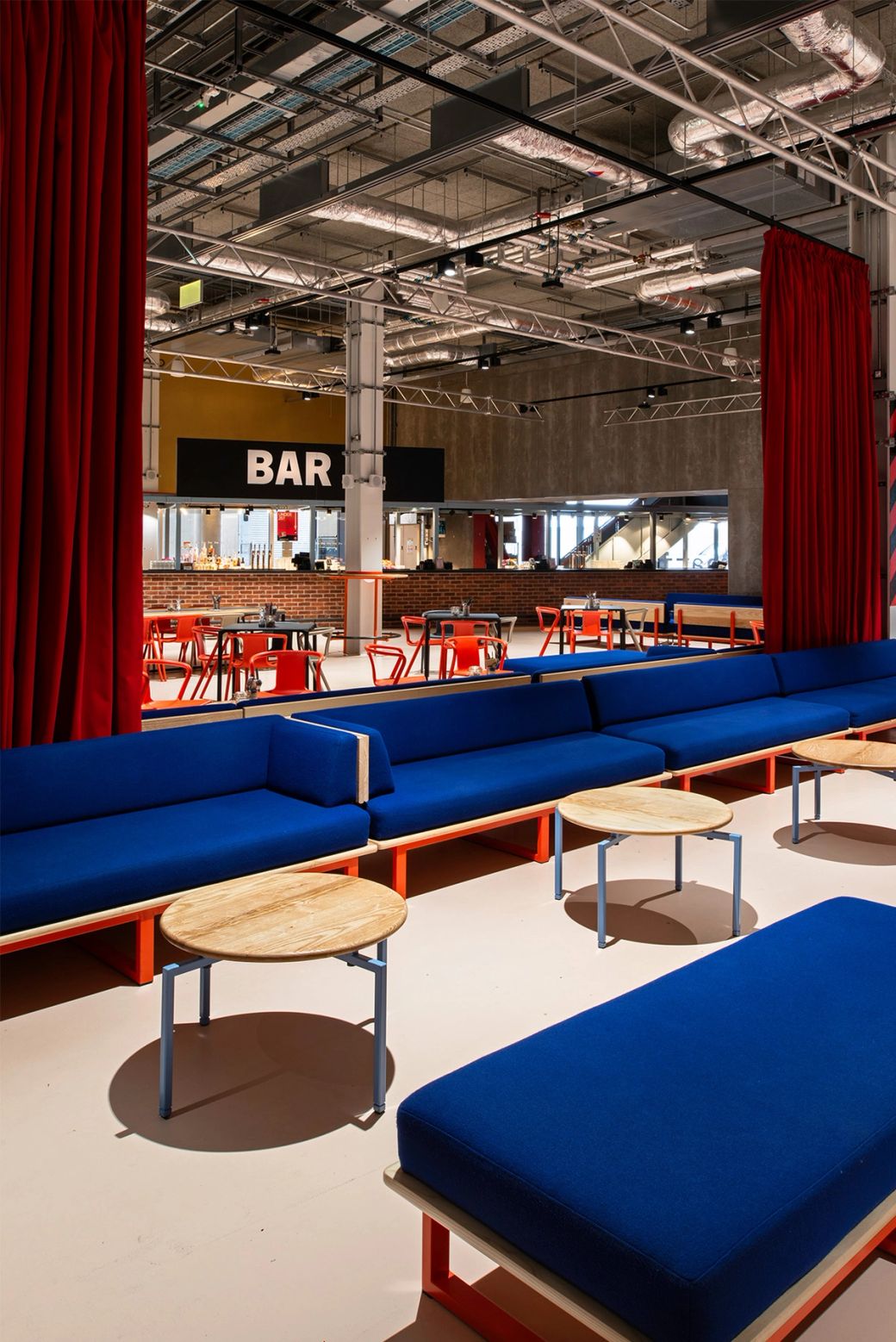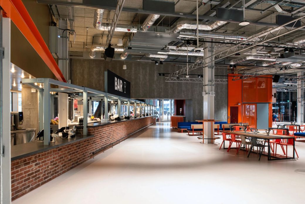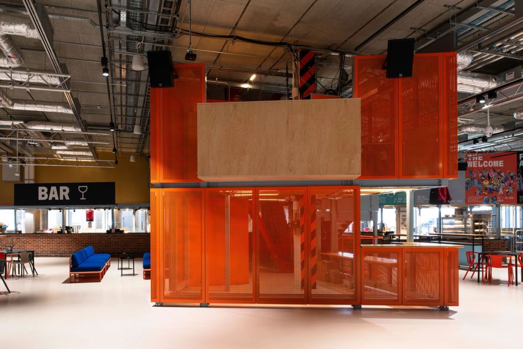 The five vibrant anchor elements in the 'Social' and 'Lounge' zones intertwine bold graphics and colours, tying together modular furniture, intuitive movable retail units, a gigantic drinks bar and a wayfinding beacon.