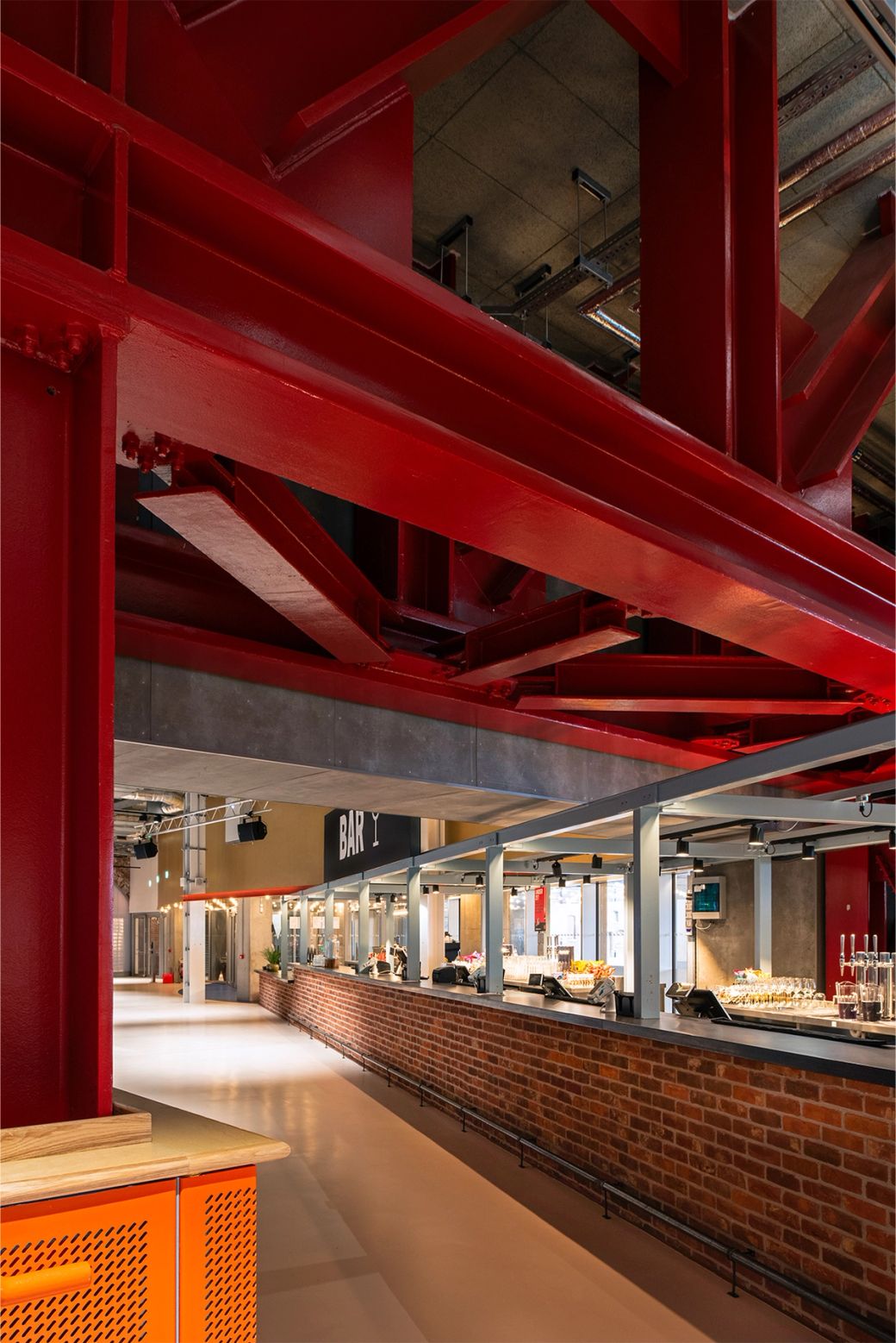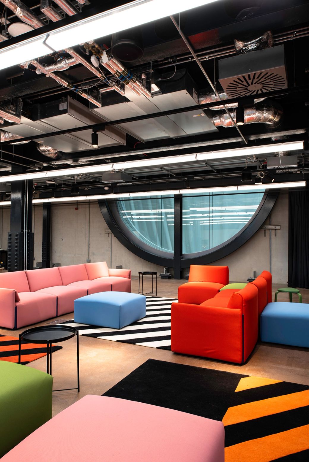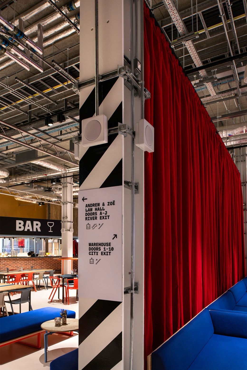 The five vibrant anchor elements in the 'Social' and 'Lounge' zones intertwine bold graphics and colours, tying together modular furniture, intuitive movable retail units, a gigantic drinks bar and a wayfinding beacon.