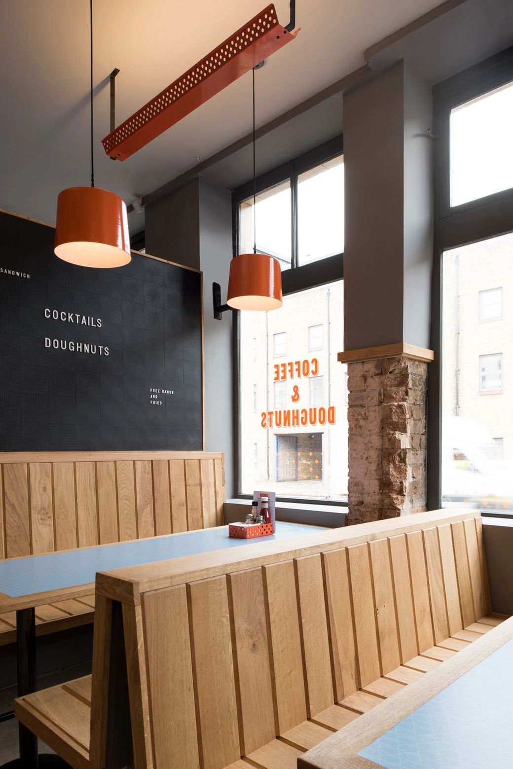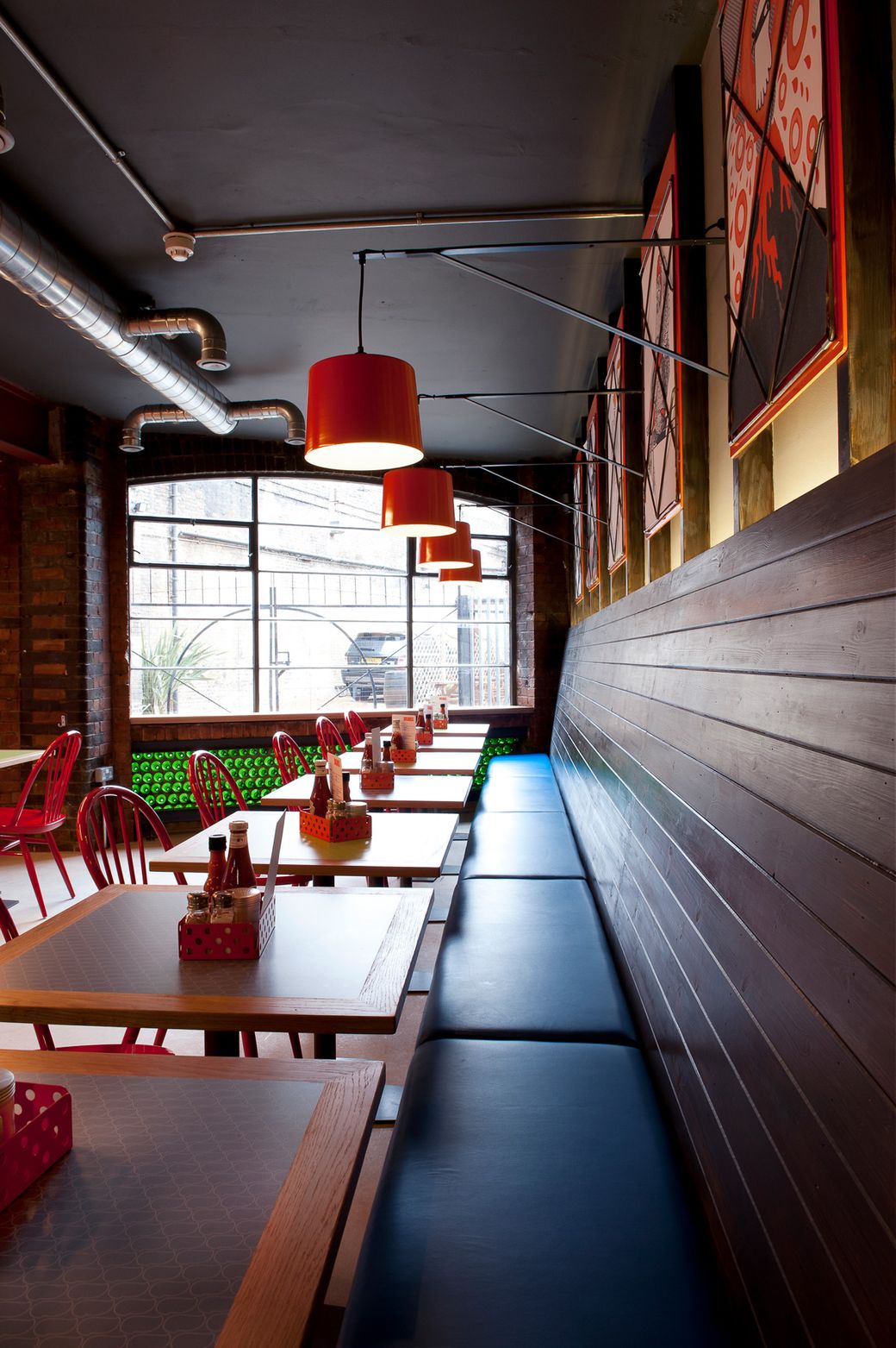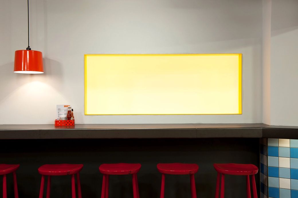 Located within a classic industrial warehouse space in London’s Shoreditch, intense high gloss colours and glowing neon signage are beautifully juxtaposed against the rough urban interior shell of raw concrete, brick and new timber. Many of the design details give a cheeky nod to typical fast food interiors but in a sophisticated and crisp way.