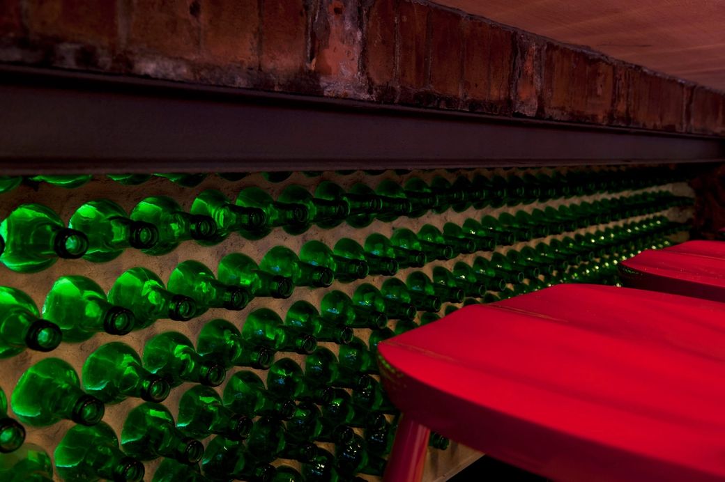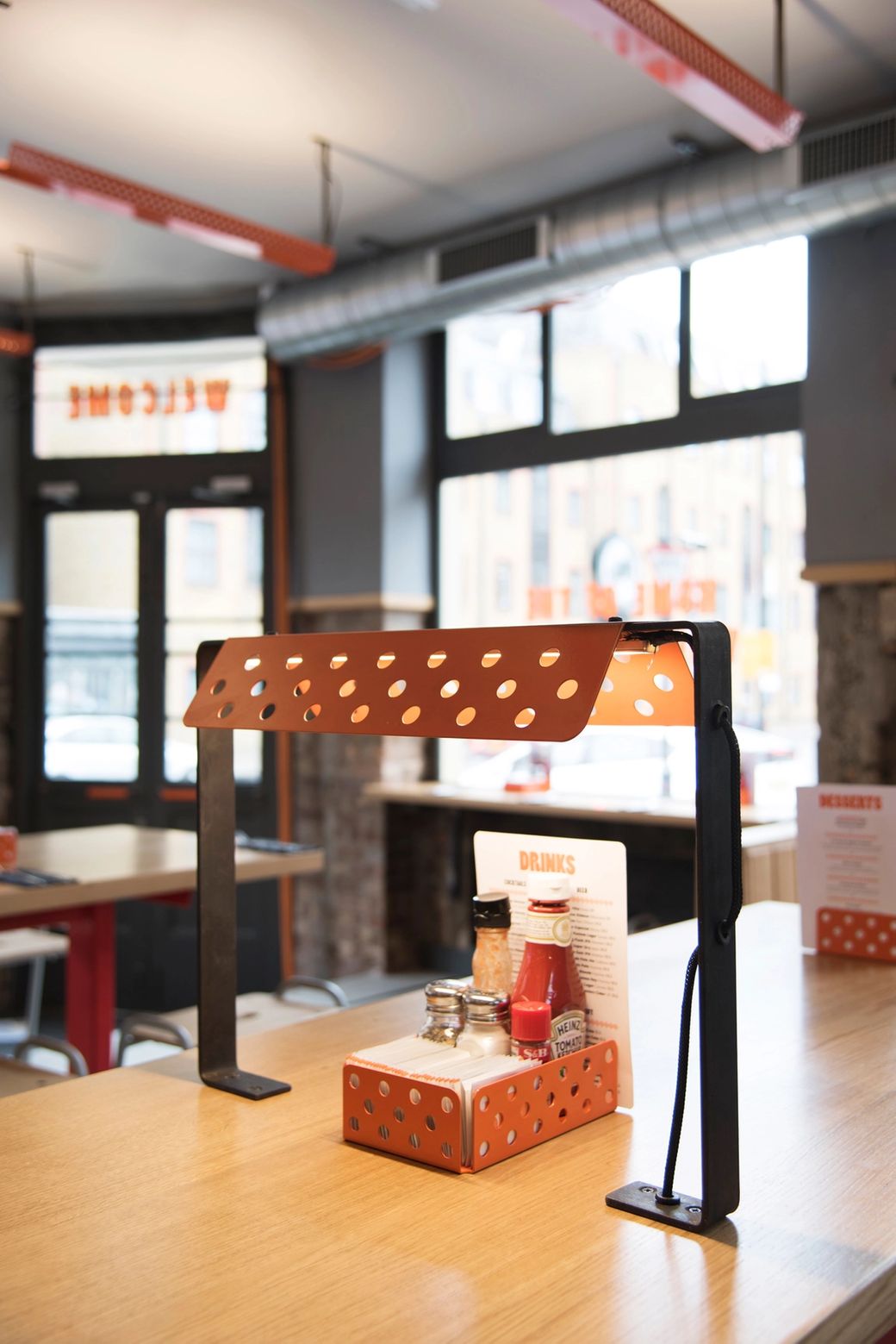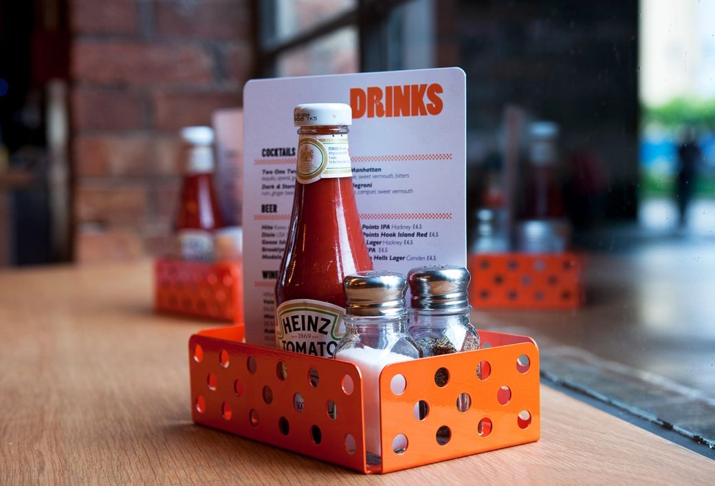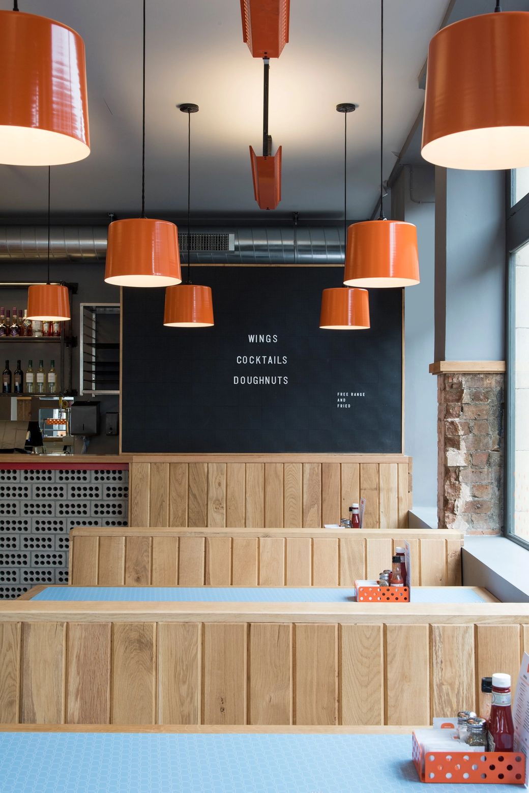 Located within a classic industrial warehouse space in London’s Shoreditch, intense high gloss colours and glowing neon signage are beautifully juxtaposed against the rough urban interior shell of raw concrete, brick and new timber. Many of the design details give a cheeky nod to typical fast food interiors but in a sophisticated and crisp way.