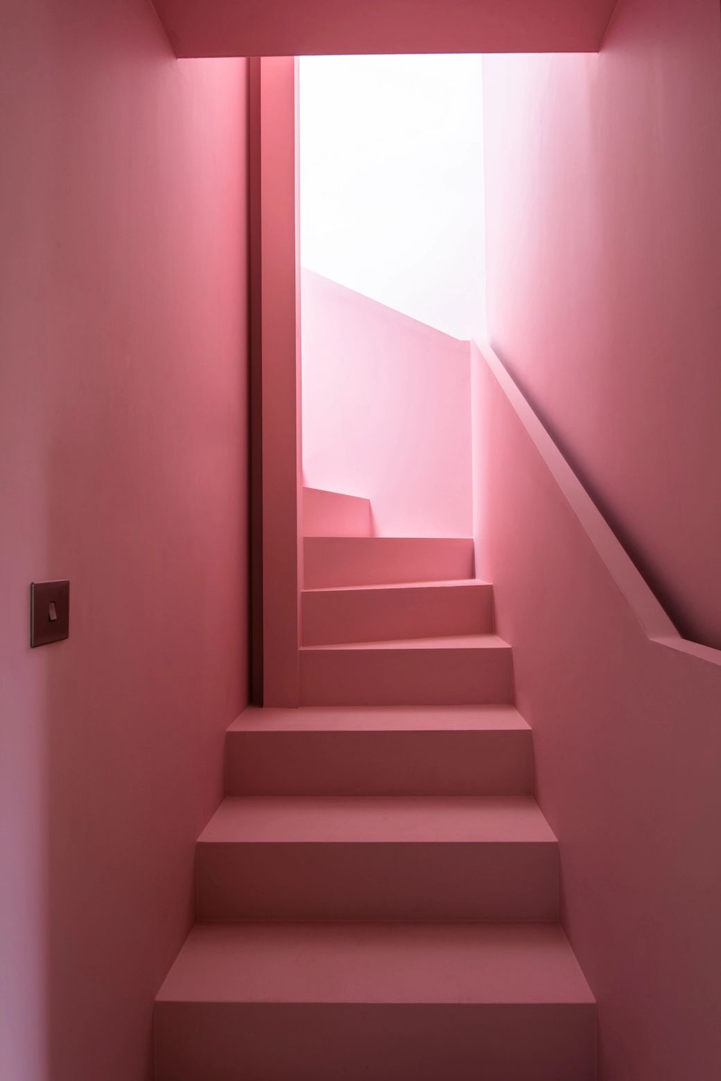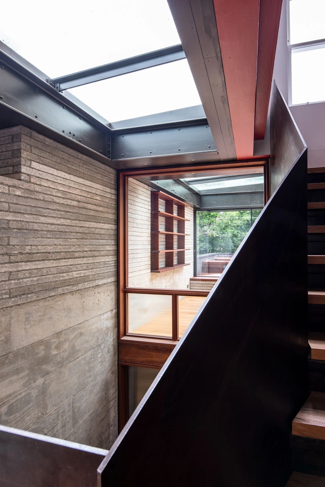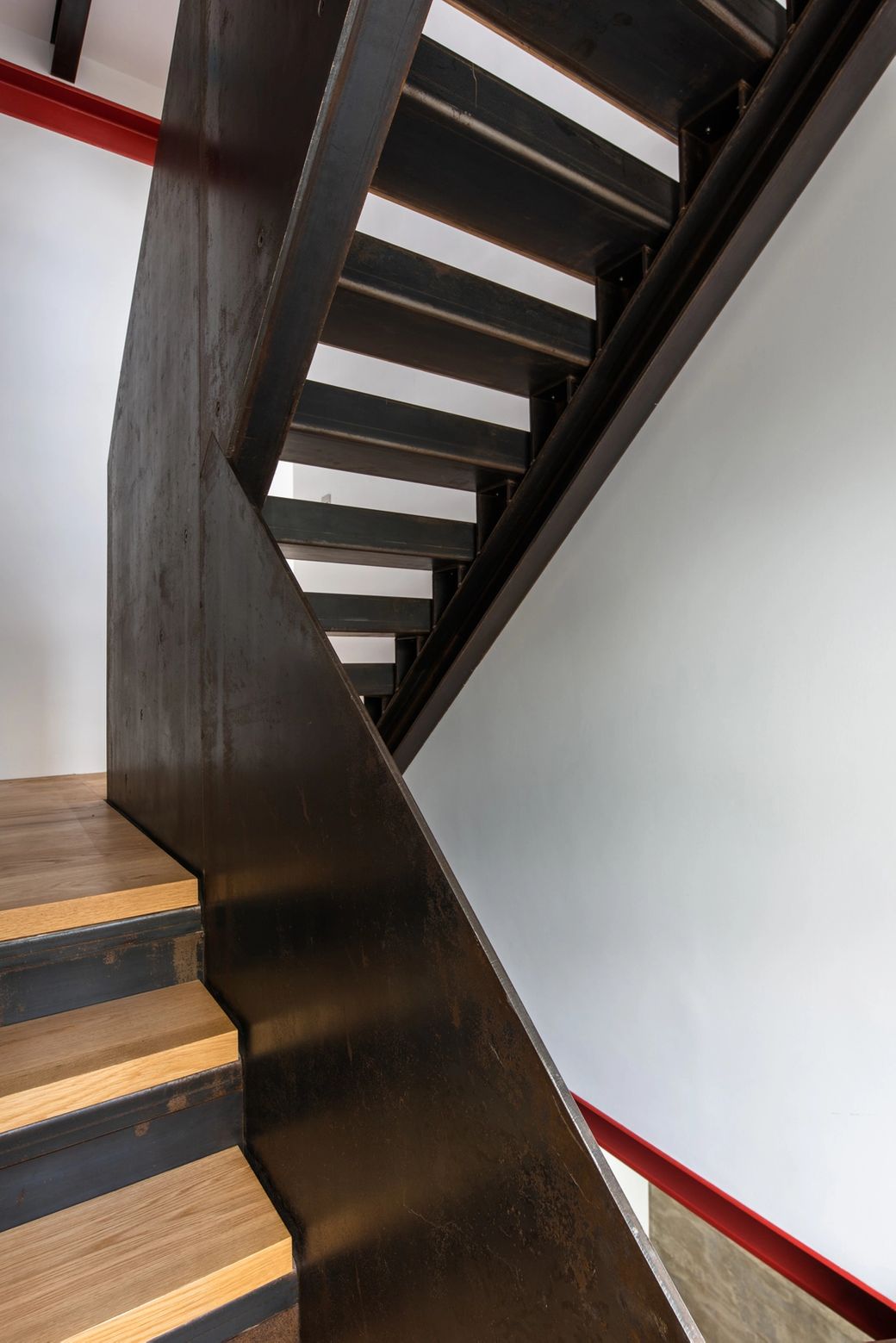 An existing two storey extension was demolished and a steel framed structure was inserted into the south west corner extending to the boundary, allowing us to remove a large area of blank wall and create a top lit Hall linking the Basement to the upper ground floor and connect back to the original stair way. A new simple sheet steel stair now could link all floors.