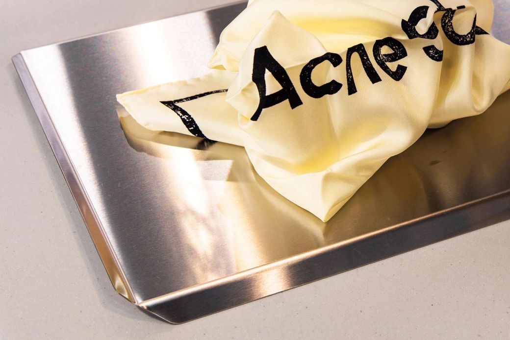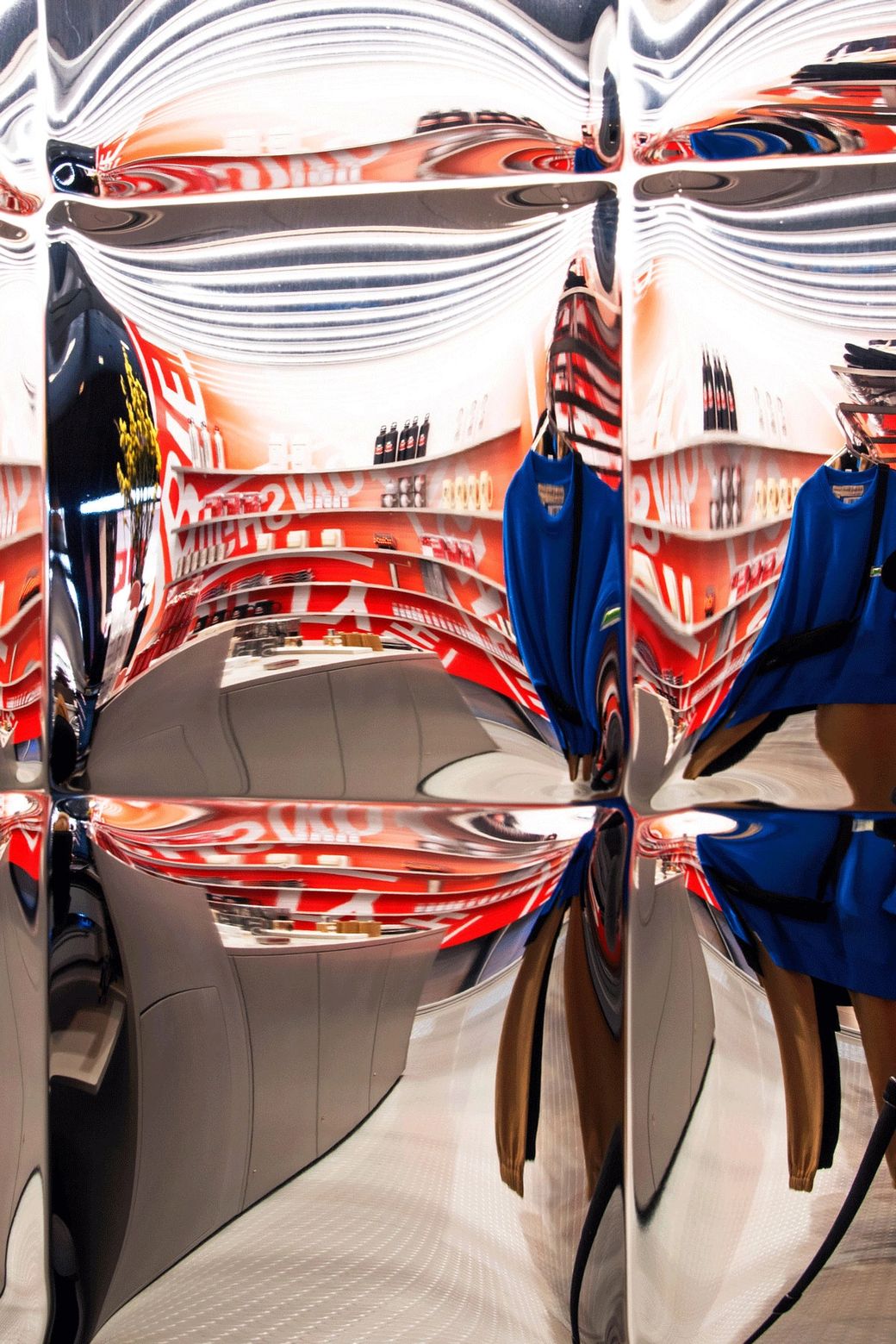 Innovative yet utilitarian, the simple aesthetic references the surrounding airport environment with stainless steel, monoblock tables and rubber flooring. The 120-square-metre space is made up of a series of distinctive rooms, including one with pillowed and distorted mirroring and another with high-tech recyclable EchoBoard.