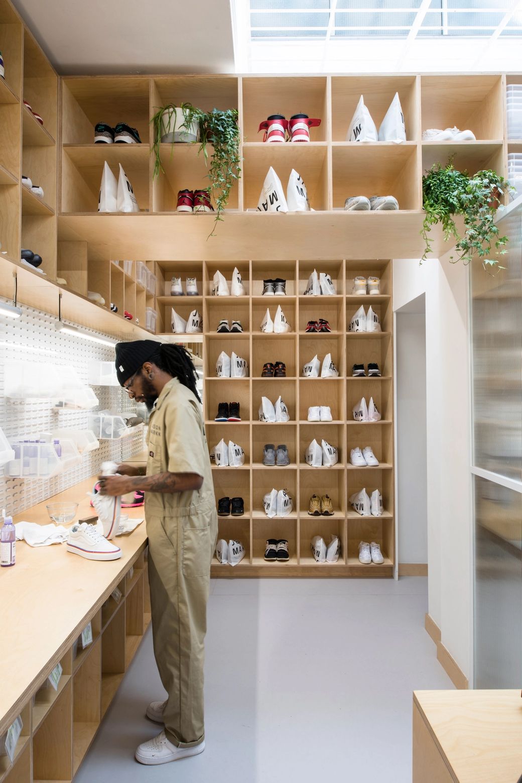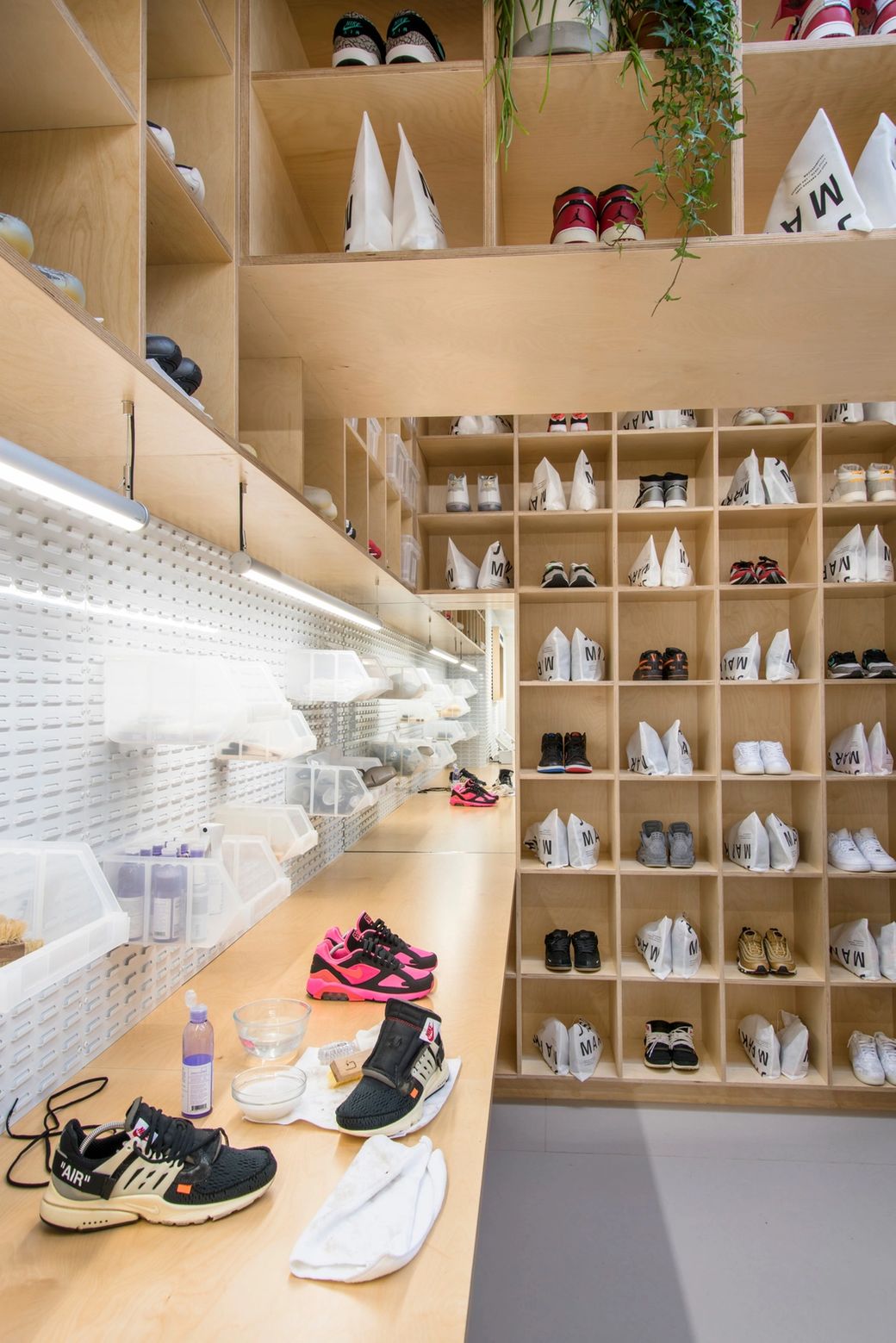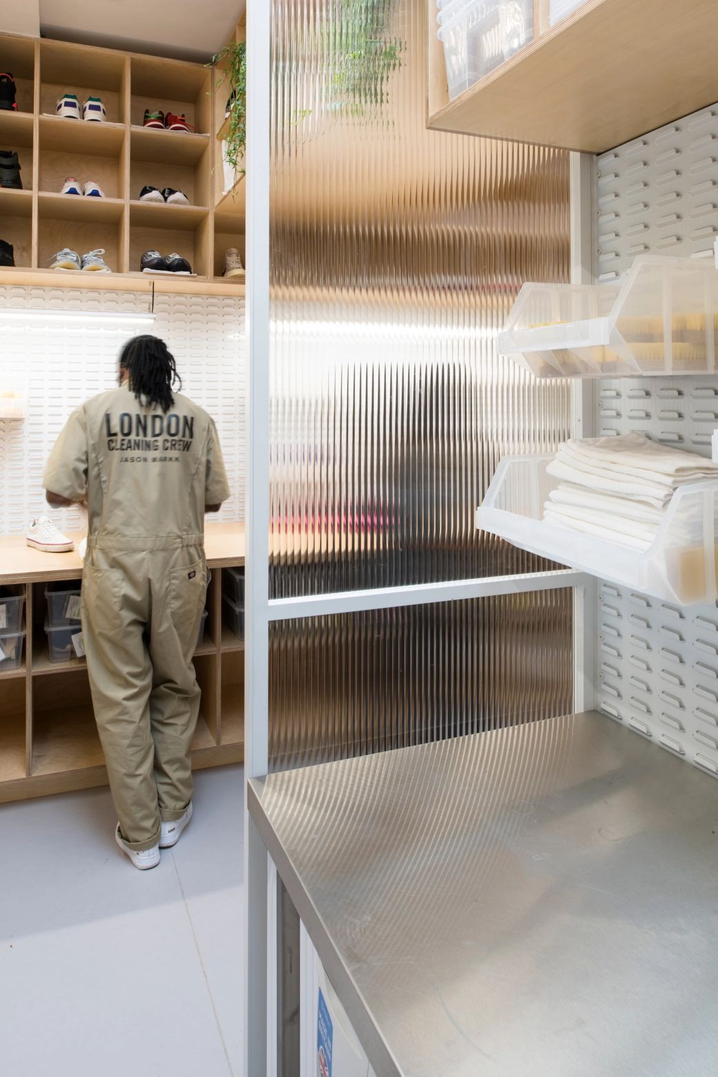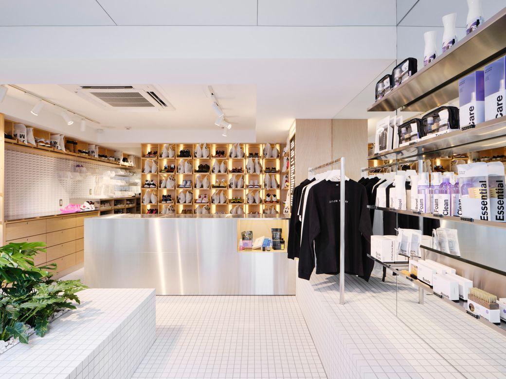 From the stainless steel branding laid subtly into the facade of the building to the simple, even lighting inside, the intention was to keep things functional yet beautiful. There are mirrored ceilings to expand the space and locally sourced timber shelving to give a sense of warmth, while metal is used in the sneaker cleaning area to celebrate the care and precision of the process.