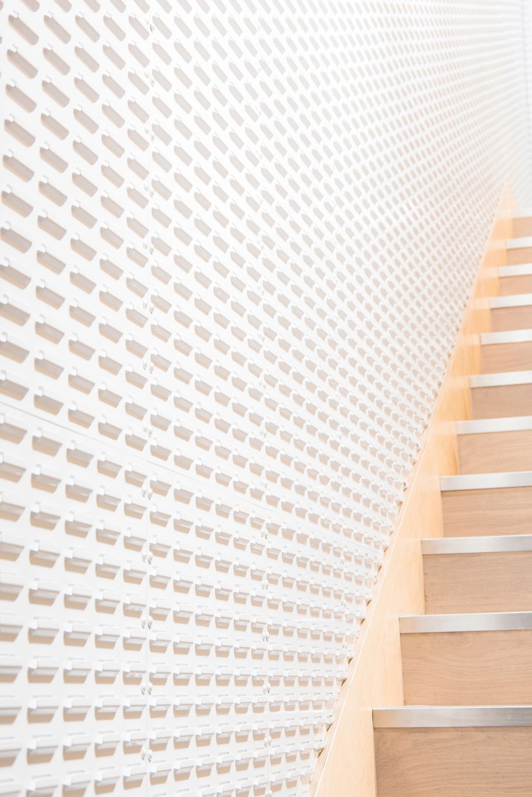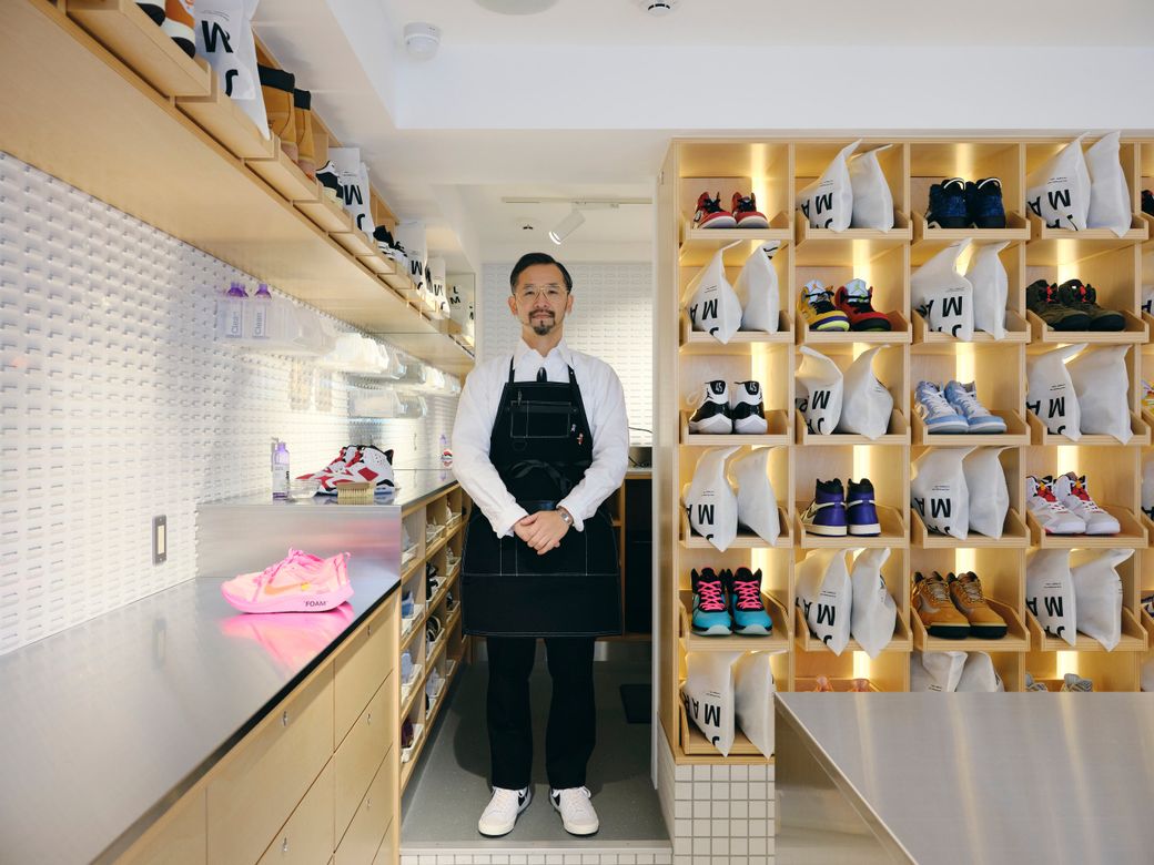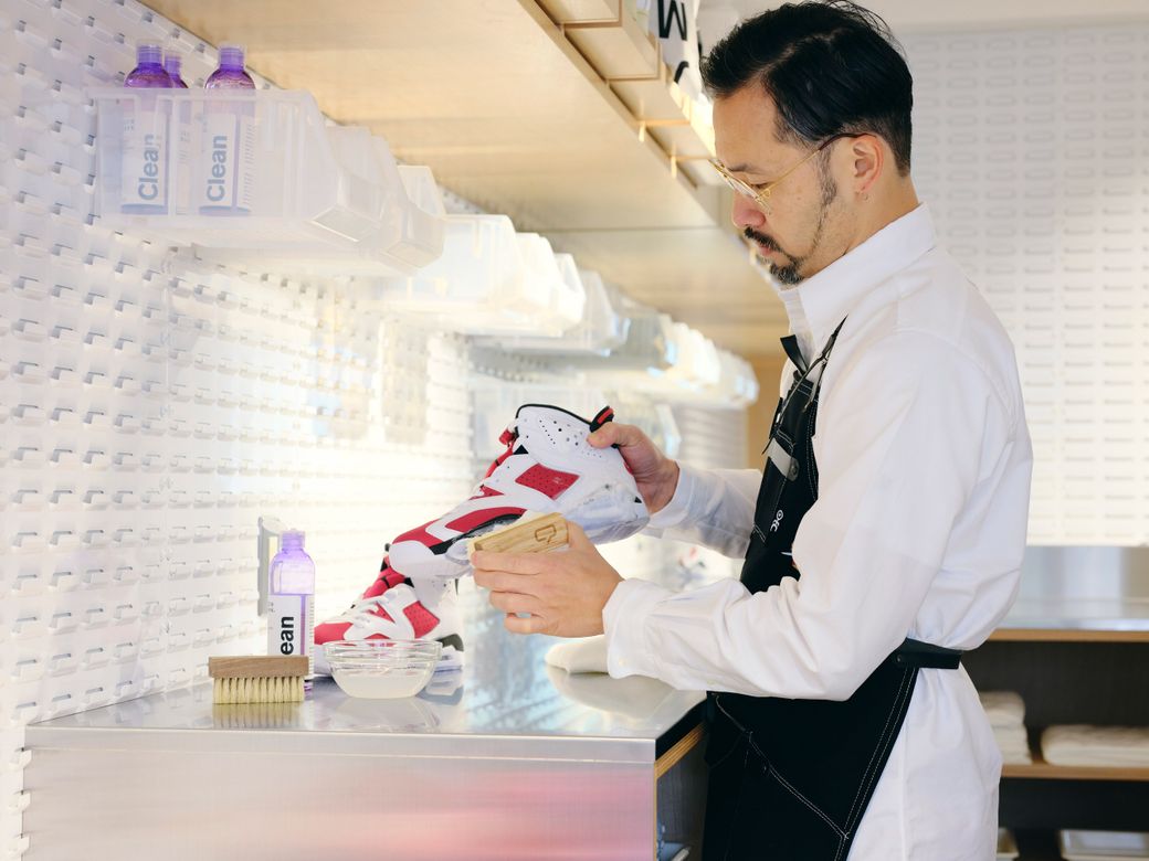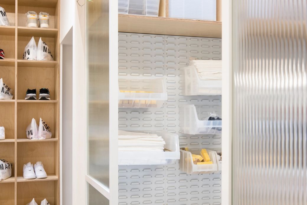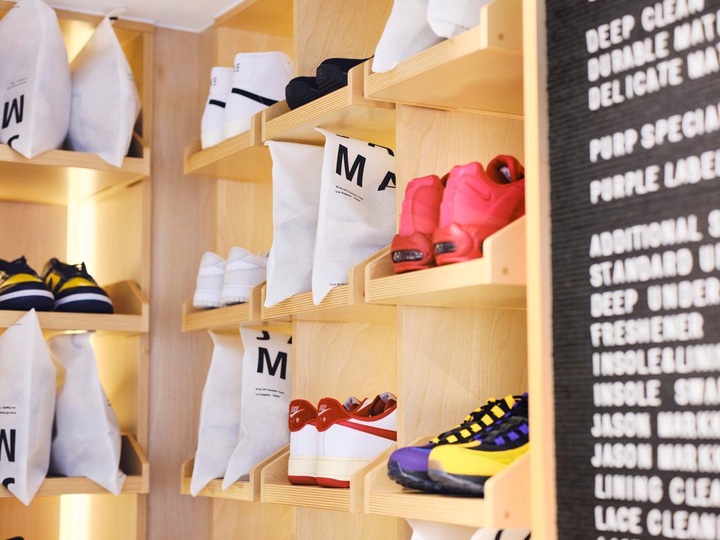 From the stainless steel branding laid subtly into the facade of the building to the simple, even lighting inside, the intention was to keep things functional yet beautiful. There are mirrored ceilings to expand the space and locally sourced timber shelving to give a sense of warmth, while metal is used in the sneaker cleaning area to celebrate the care and precision of the process.