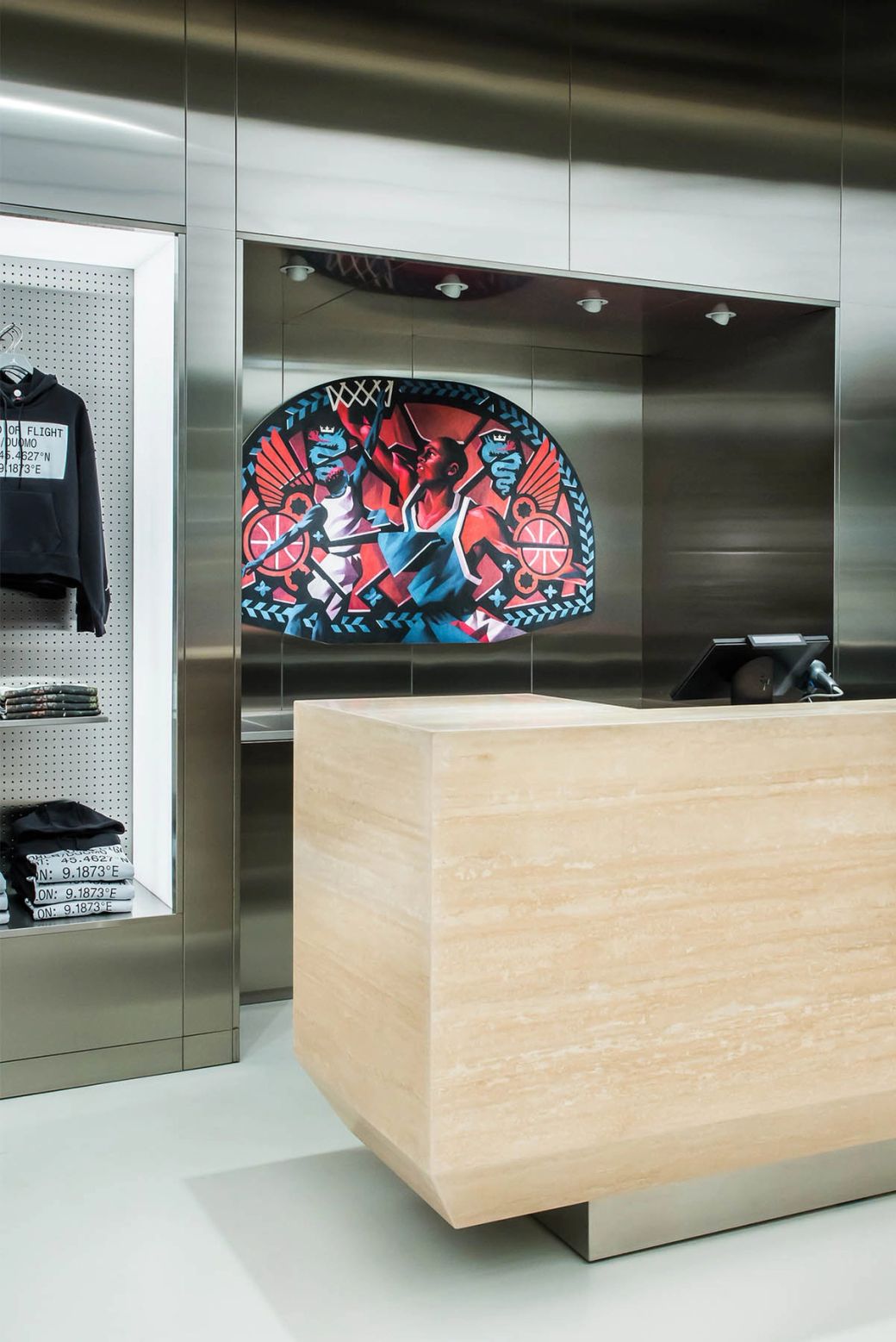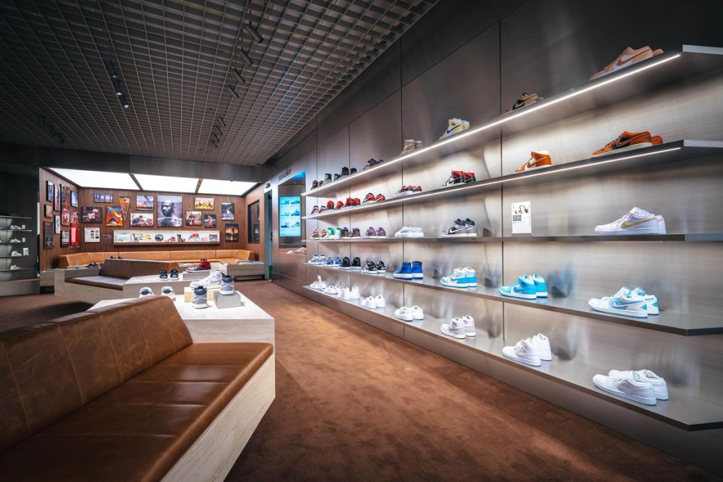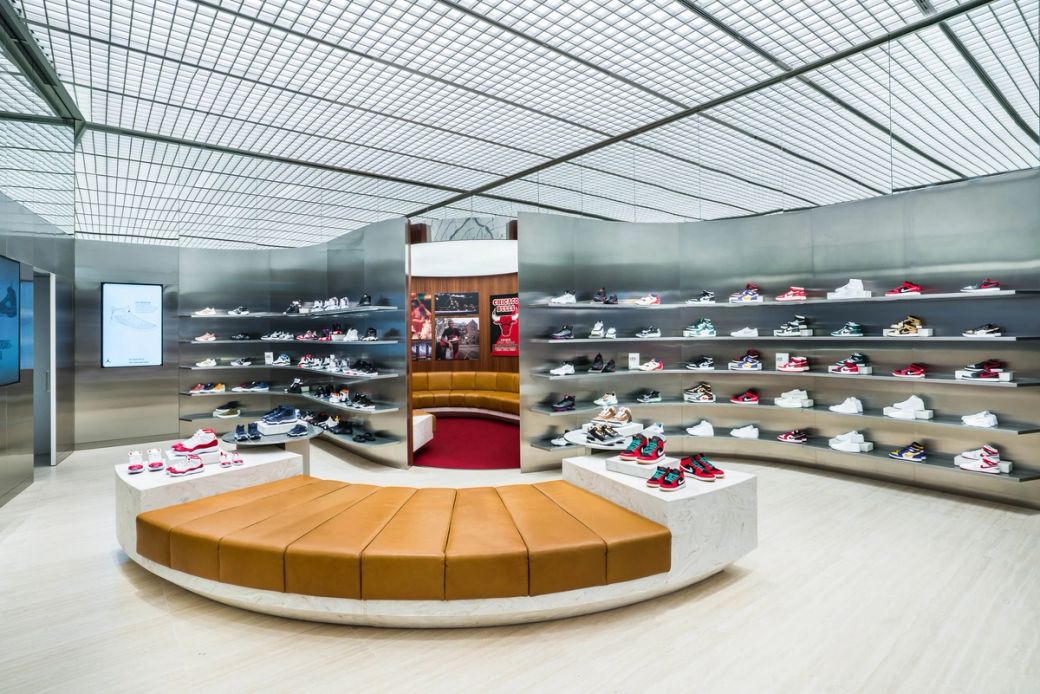 Jordan’s position as a cultural icon is celebrated within the stores, which serve as a tribute to basketball culture. A dedicated SNKRS pick-up area serves product drops and is supported with on-site customisation, with an adjacent Flight Lounge that seeks to connect the local community with legendary pieces from the archive.