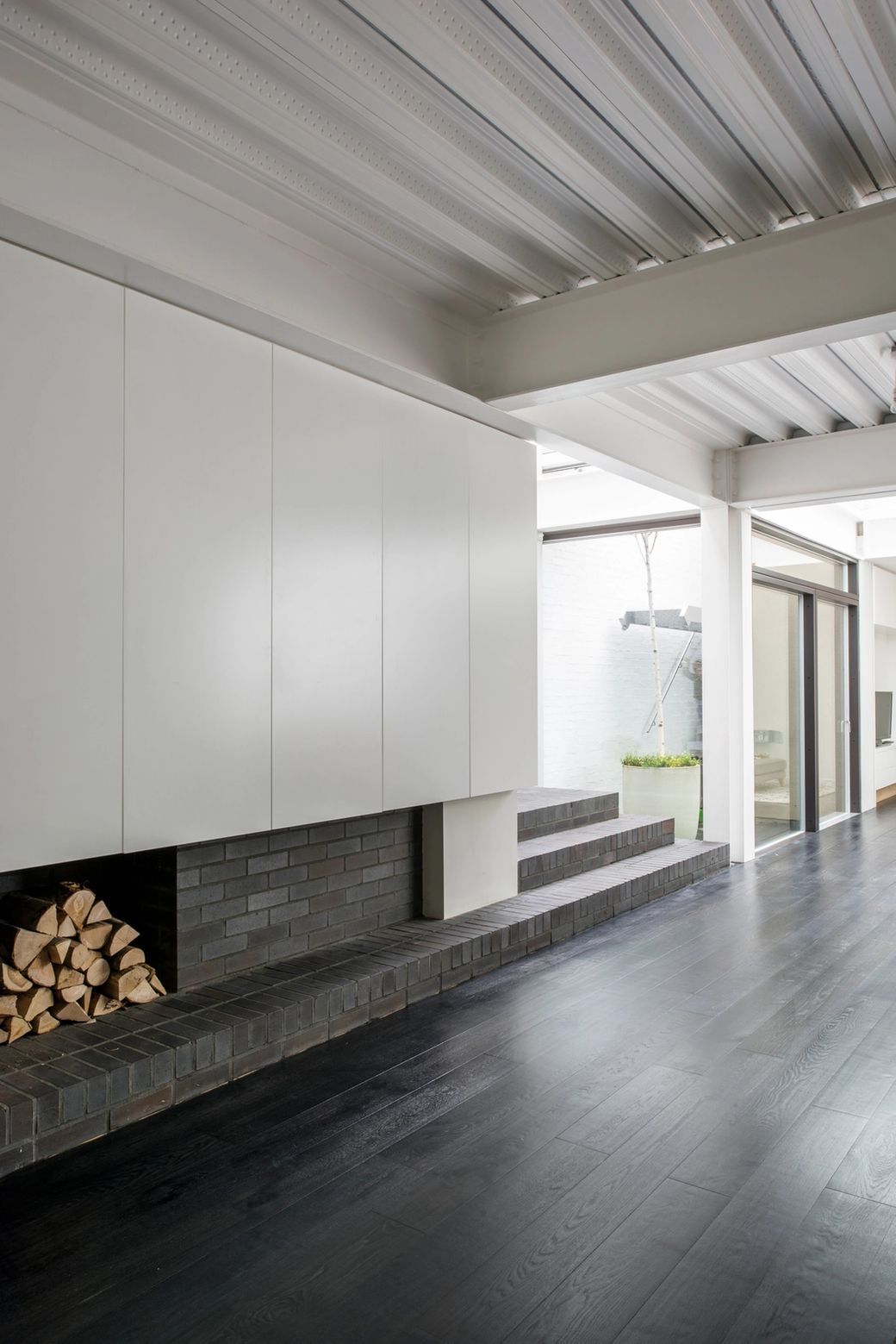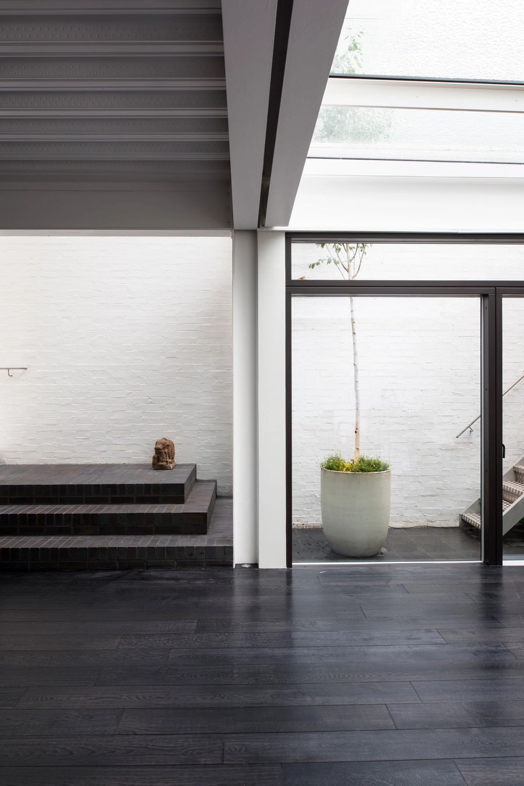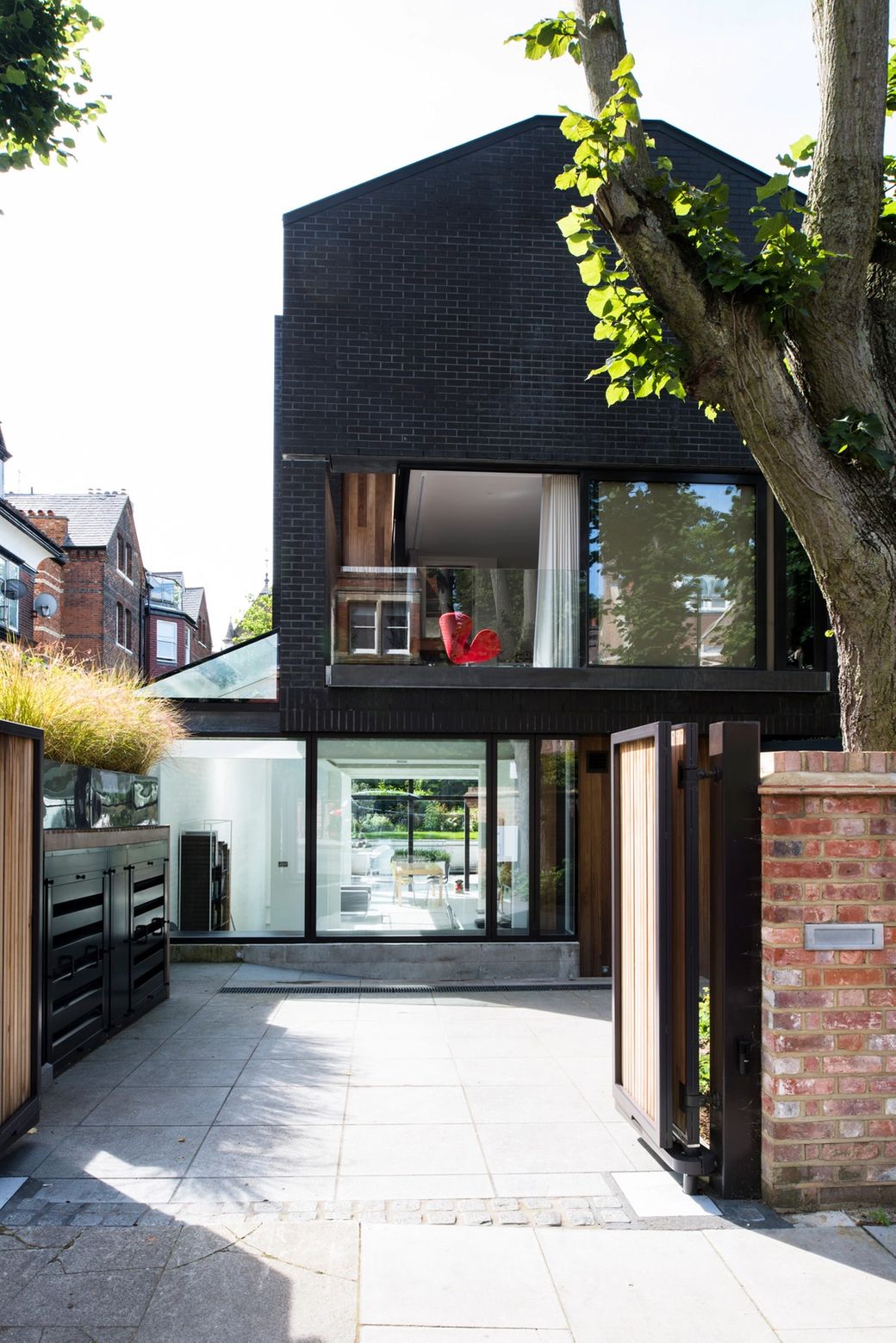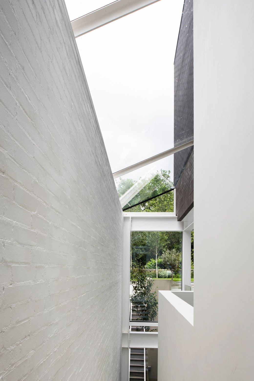 We intentionally reverted to a cliché of the suburban form. Brick, but black, a pitched roof, but chopped back, a bay window, but flush and square. It is an essay on a new post-modernism, but mannered, respectful and discreet. The two stories of sleeping quarters are held over the ground floor via a regiment of steelworks, within a dark and moody brick shed-like form. The ground floor, set into the landscape, is transparent and exists only as a consequence of the brick structure over it and a vast basement hidden below. The project was highly commended by Architectural Review 2017.
