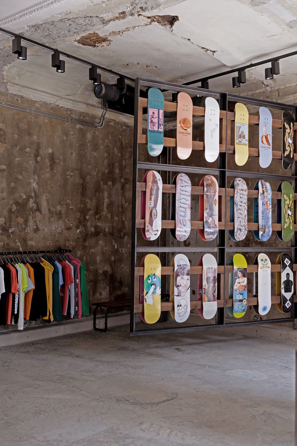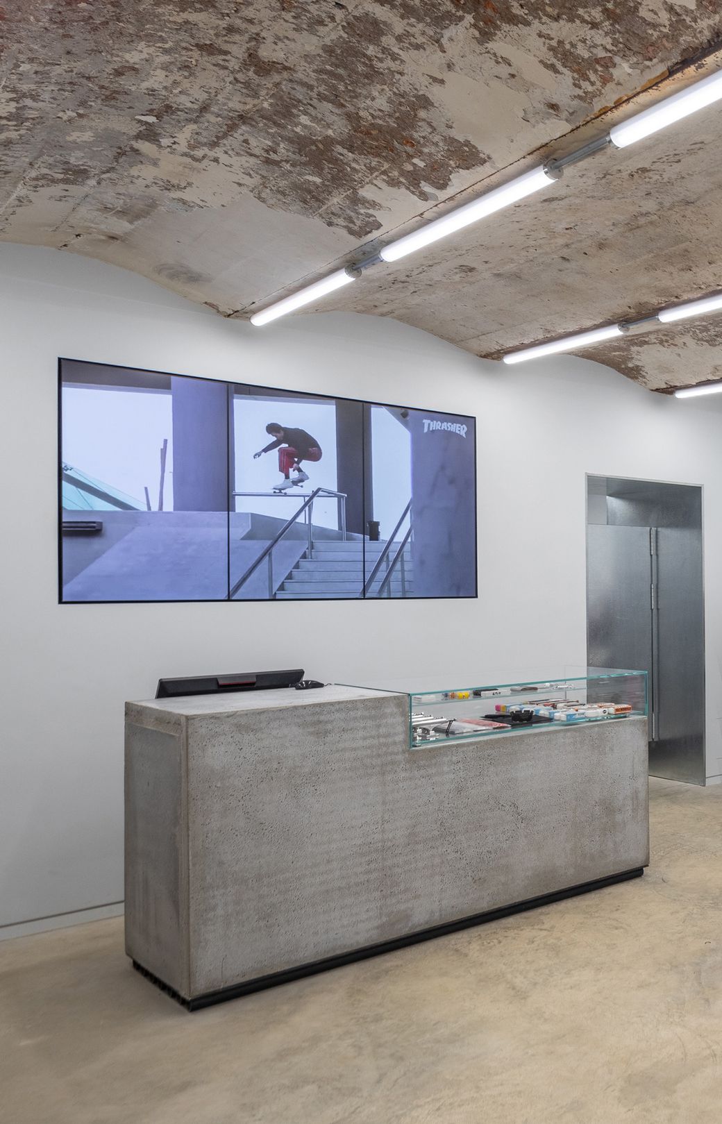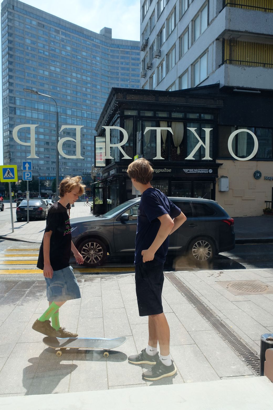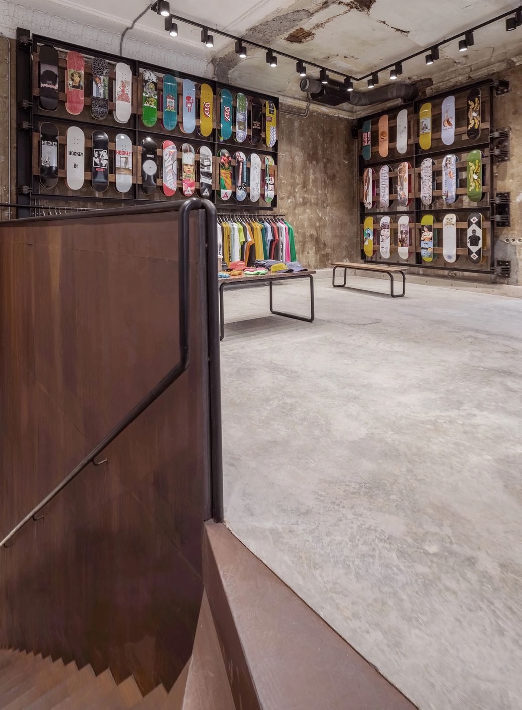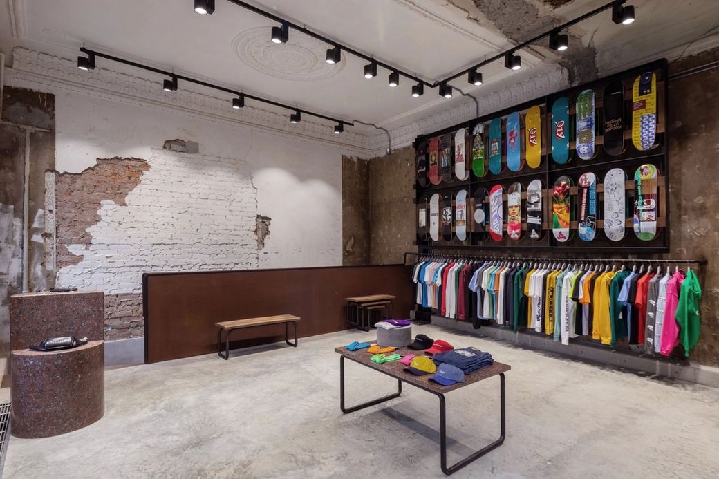 Oktyabr is located in the very heart of Arbat. This neighbourhood has a special significance for the history of the Russian skate scene with its skateable landmarks, including the famous Kaluzhskaia Square. The designers looked to the district's iconic landmarks to create a locally relevant material palette that sits confidently against the character of the existing building.