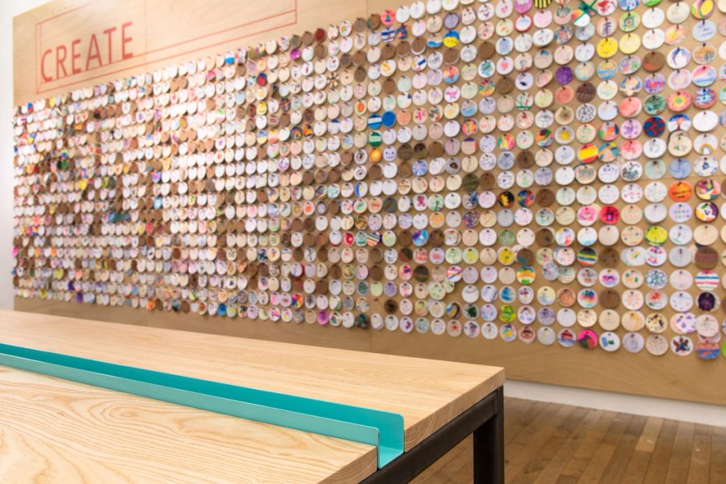 Following our work on the Tate Modern Kiosks, we designed and built an area dedicated to creativity within the Turbine Hall shop. Aimed at children but open to all, the “Create” wall encourages visitors, old and young, to express their artistry and display their work for all to see.