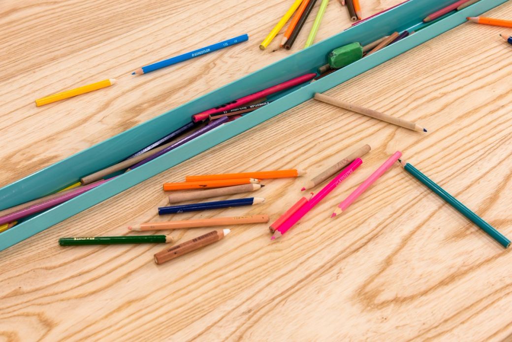 The wall, developed at BrinkWorks, our East London workshop, features 1,360 mounted studs that hang discs of off-cut cardboard. We also designed long tables with central recesses for pencils surrounded by stools with powder coated legs in peach, teal, cream or red.
