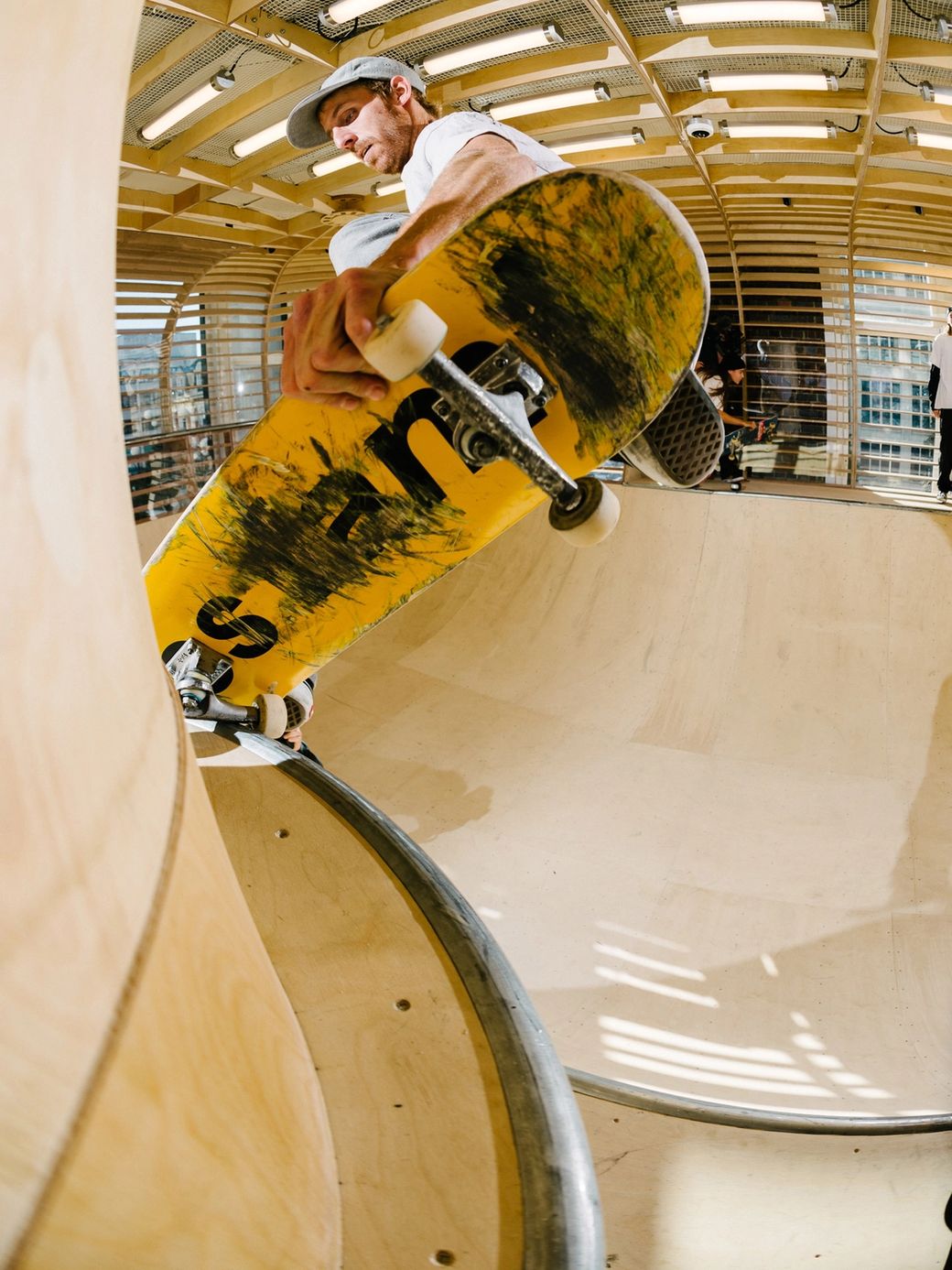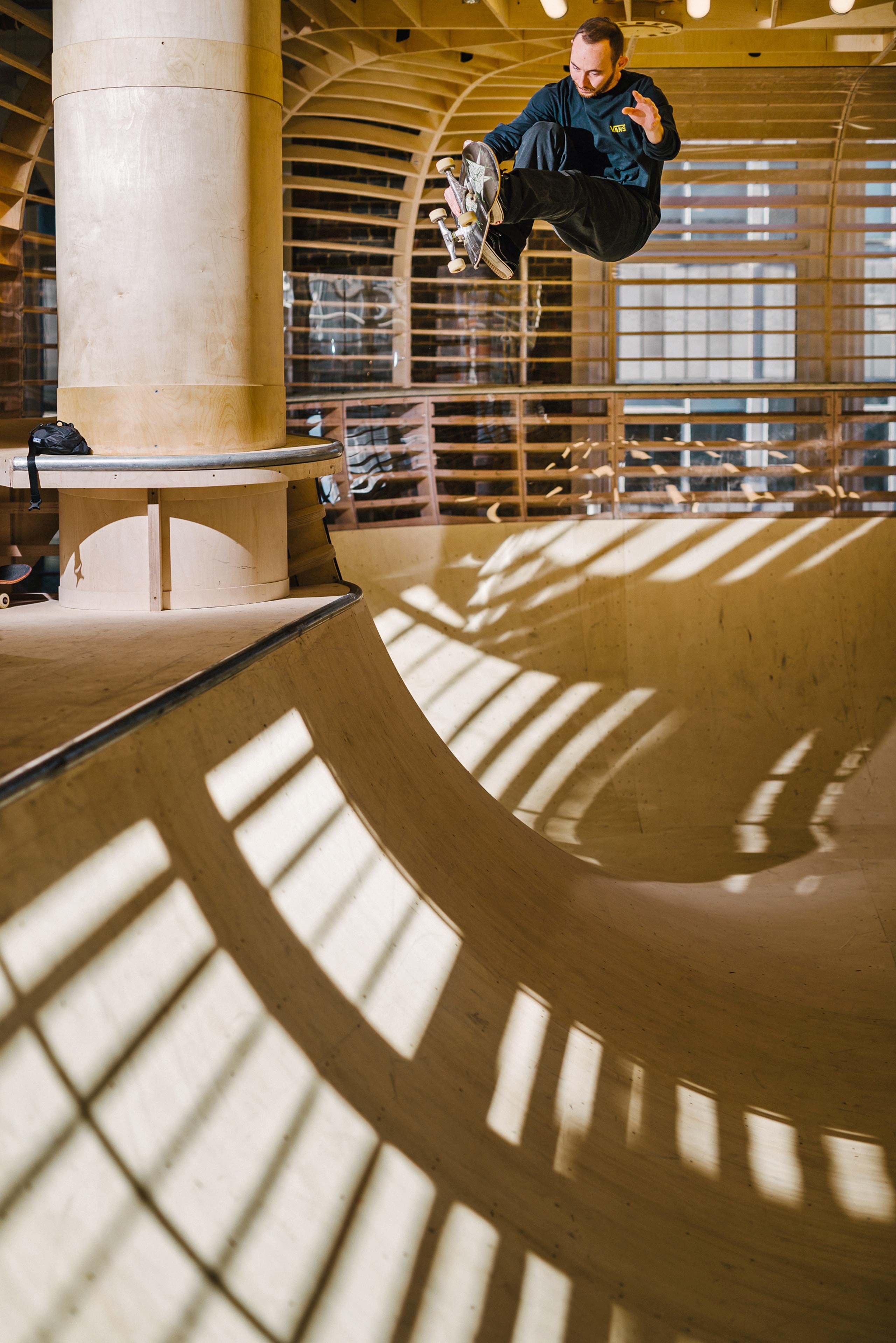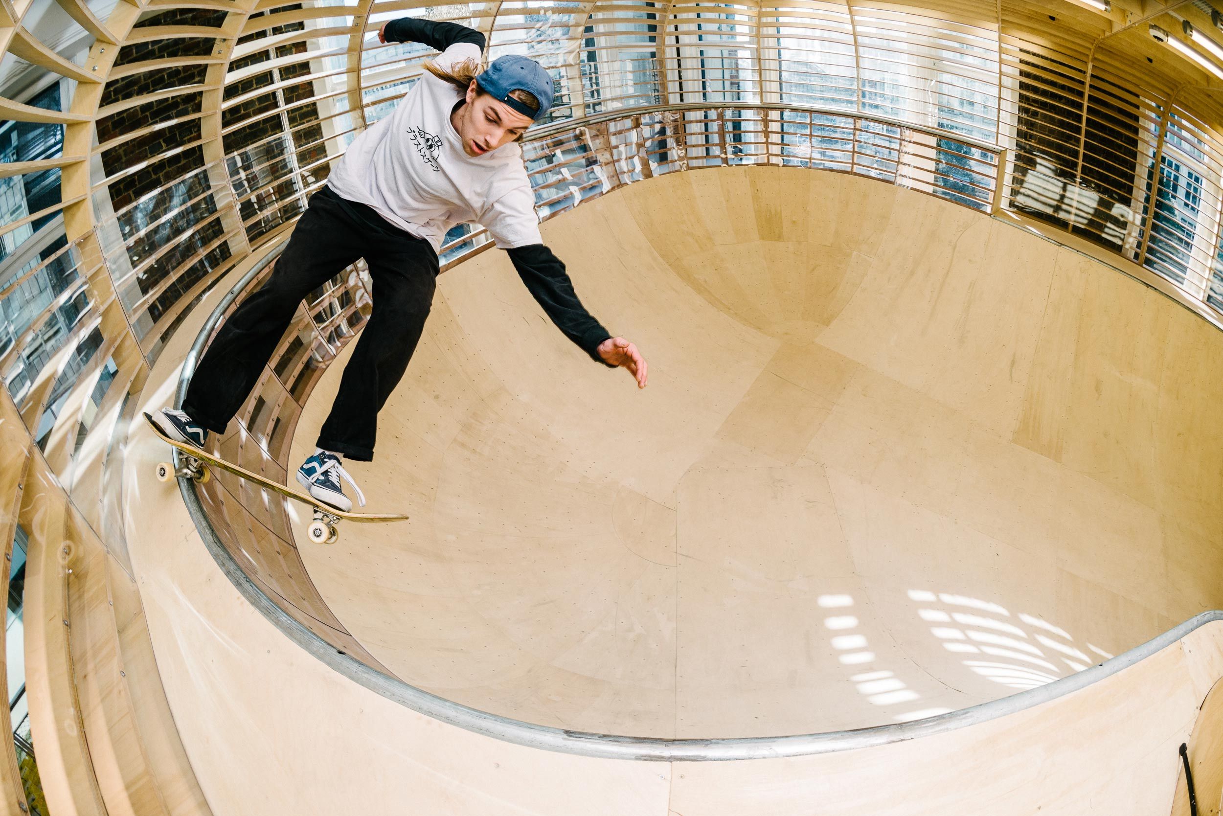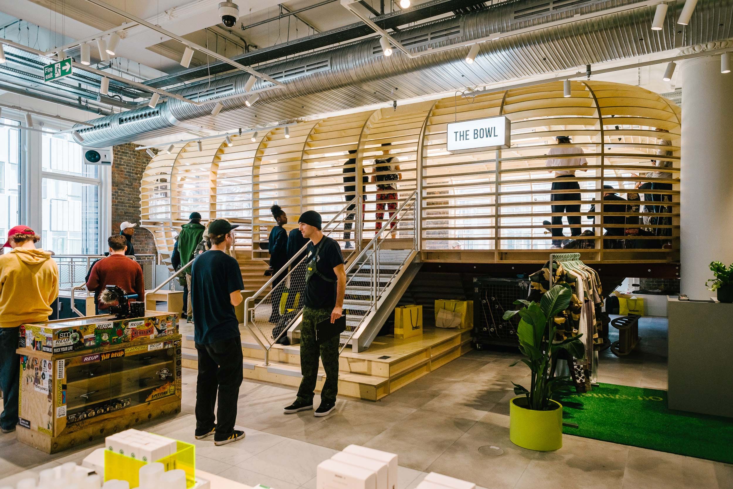 The installation, within the menswear department of Selfridges, pays homage to the original travelling skate park structures of the 1970s and was engineered by specialist skate builders Four One Four. Shoppers are invited to watch the action through the transparent Plexiglas cladding, while the bowl is designed to extend as high as possible without obstructing sight lines. Crucially, the structure had to be genuinely challenging to skaters because the brand’s authenticity relied on it being appealing and rewarding to use.