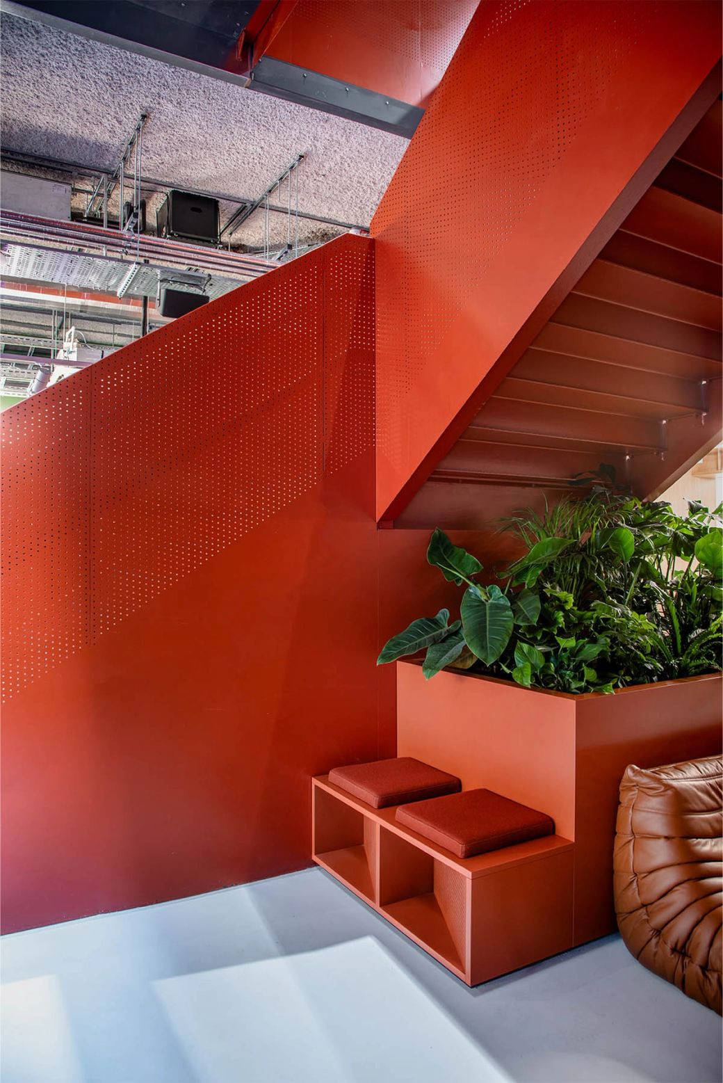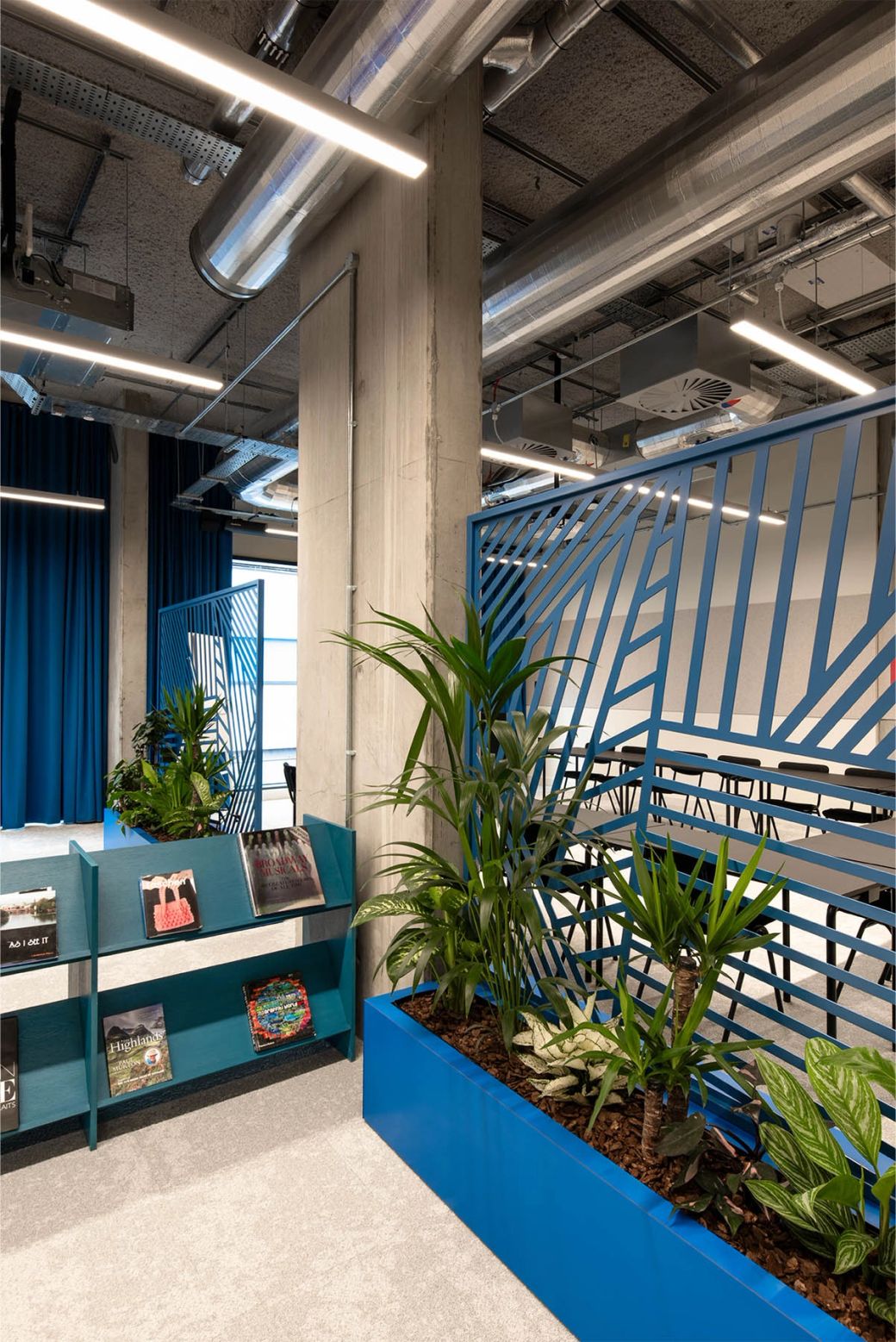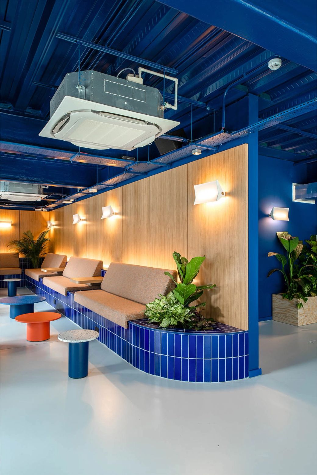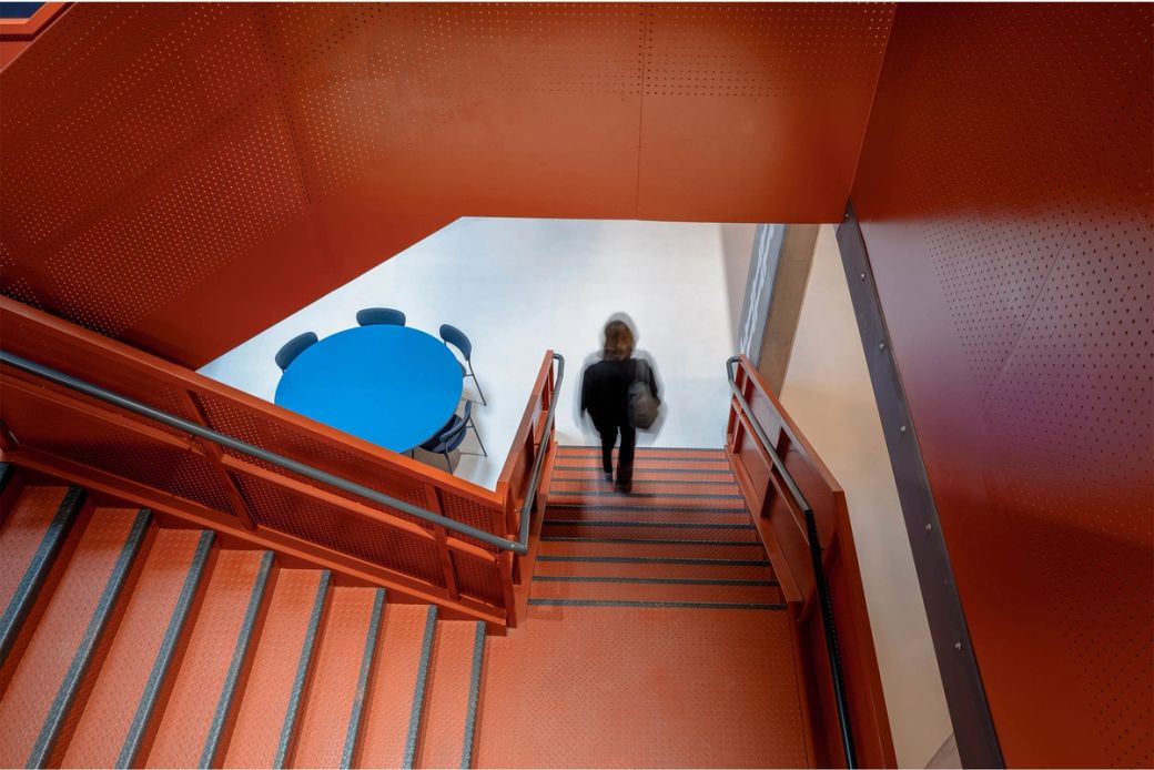 Inspired by Glasgow's industrial legacy and eclectic architectural landscape, we integrated materials such as concrete, sandstone, and steel, combining them with playful graphics and local cultural references. Glasgow's shipbuilding history is referenced through navy blue and red oxide steel sections and visible mechanical fixings, while a "razzle dazzle" camouflage pattern designed by a Glasgow School of Art alumnus in WWII adorns graphic screens and tiles.