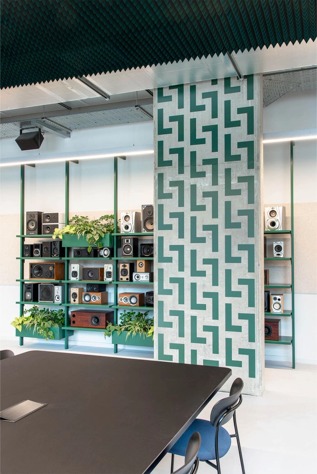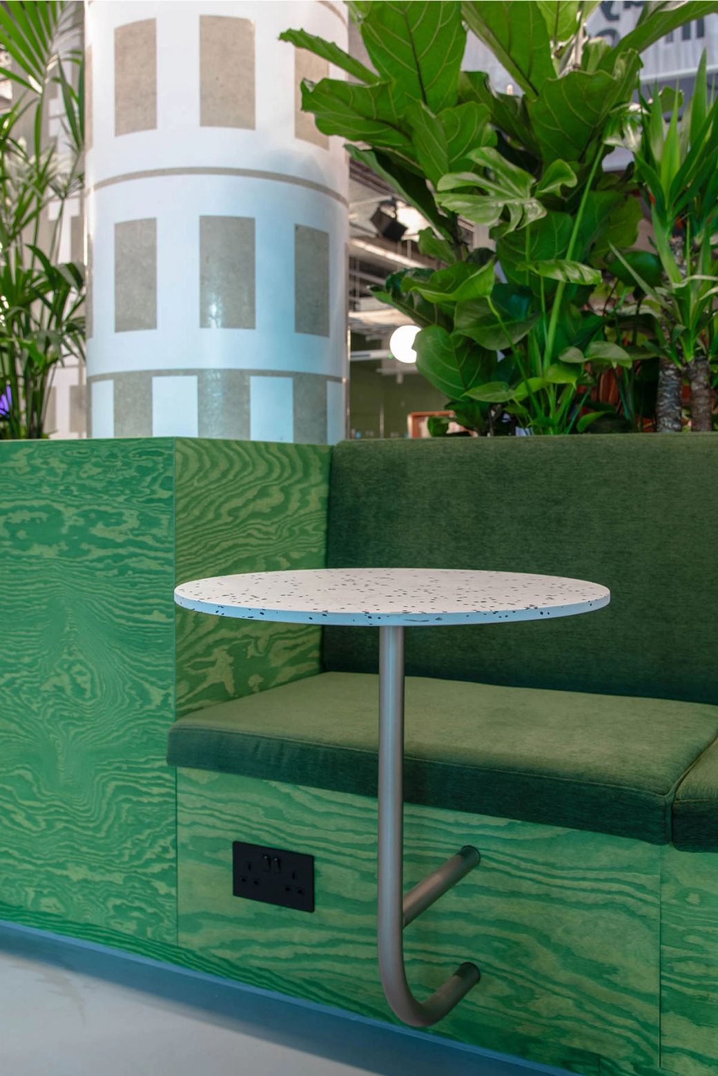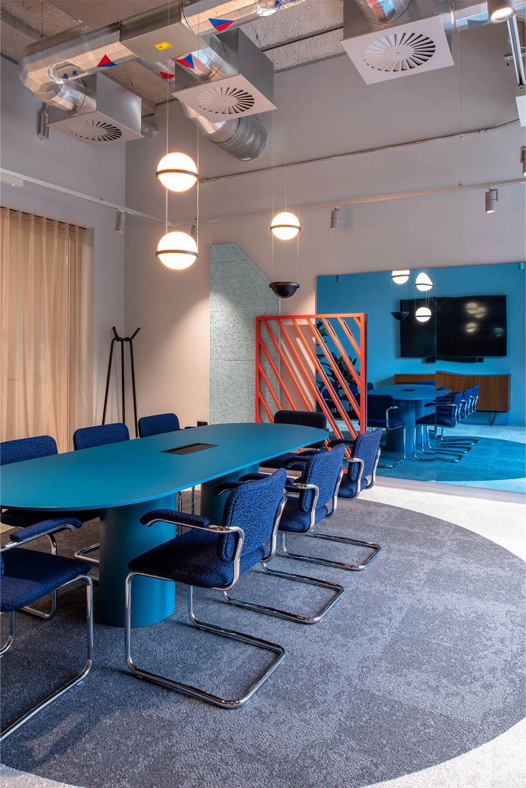 Inspired by Glasgow's industrial legacy and eclectic architectural landscape, we integrated materials such as concrete, sandstone, and steel, combining them with playful graphics and local cultural references. Glasgow's shipbuilding history is referenced through navy blue and red oxide steel sections and visible mechanical fixings, while a "razzle dazzle" camouflage pattern designed by a Glasgow School of Art alumnus in WWII adorns graphic screens and tiles.
