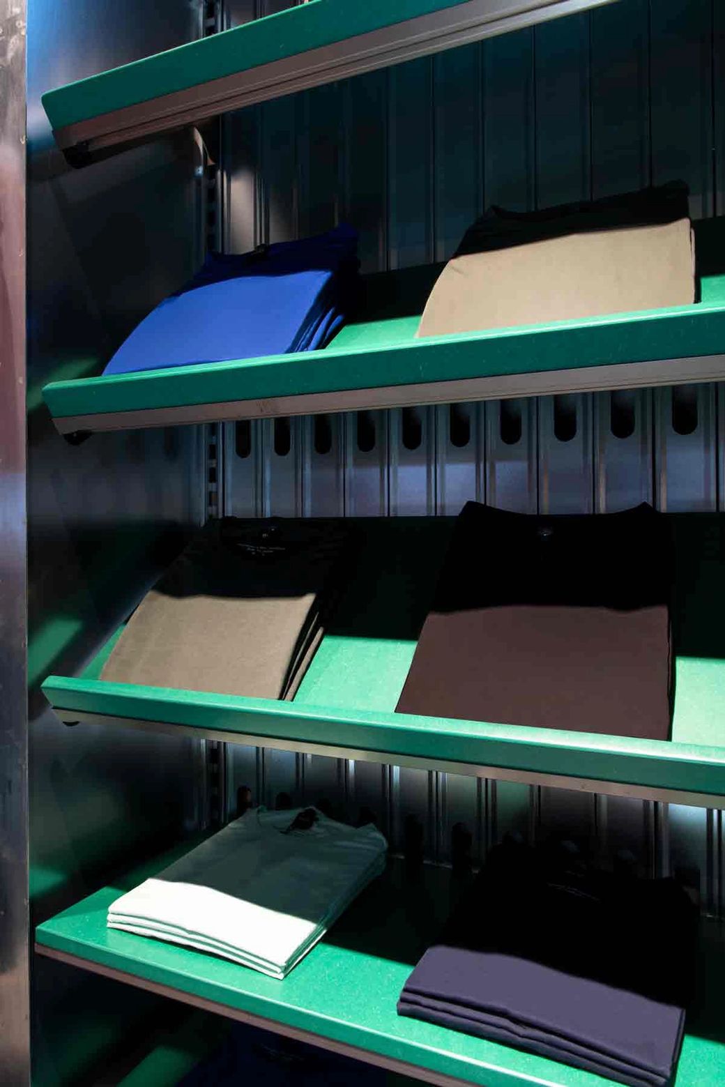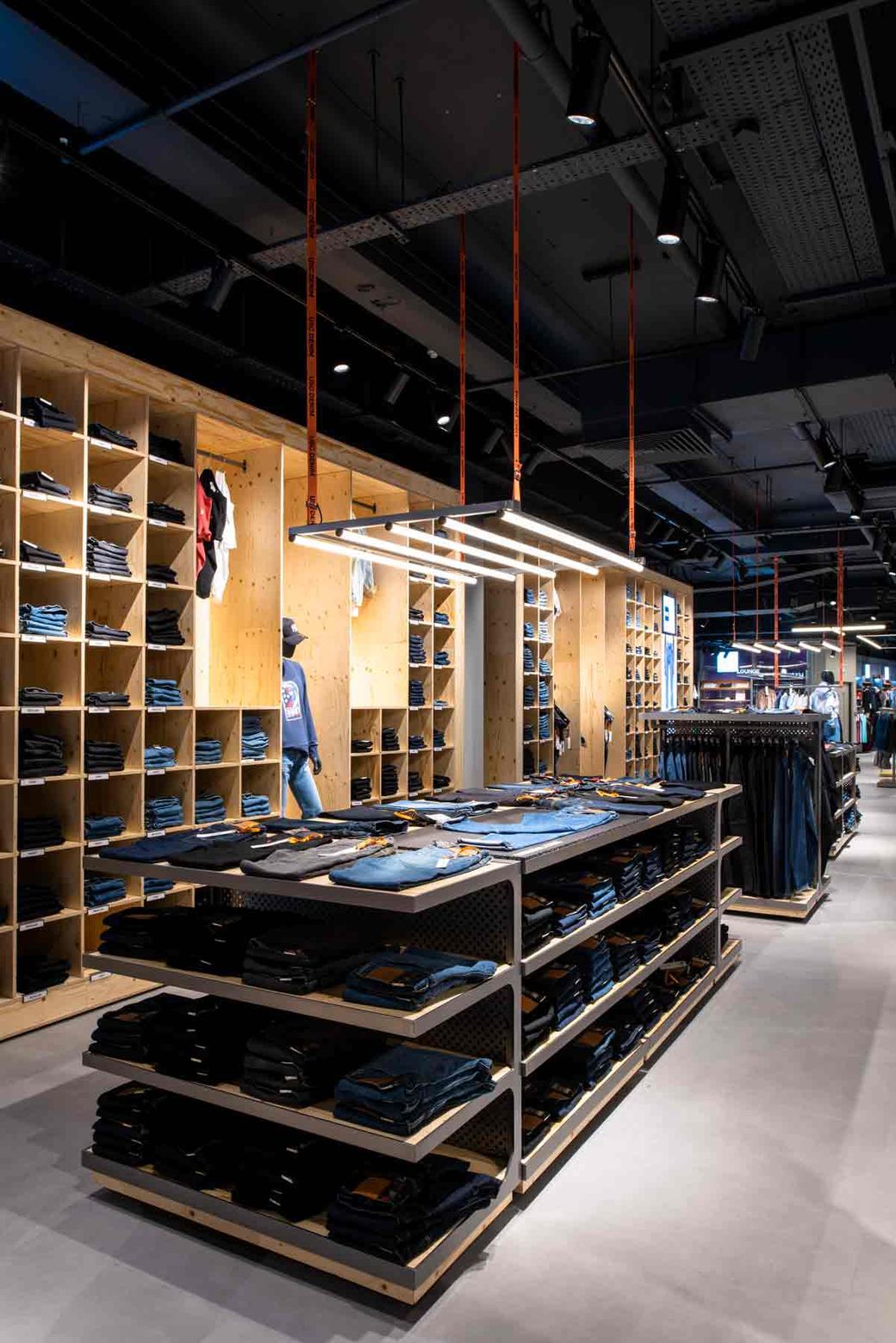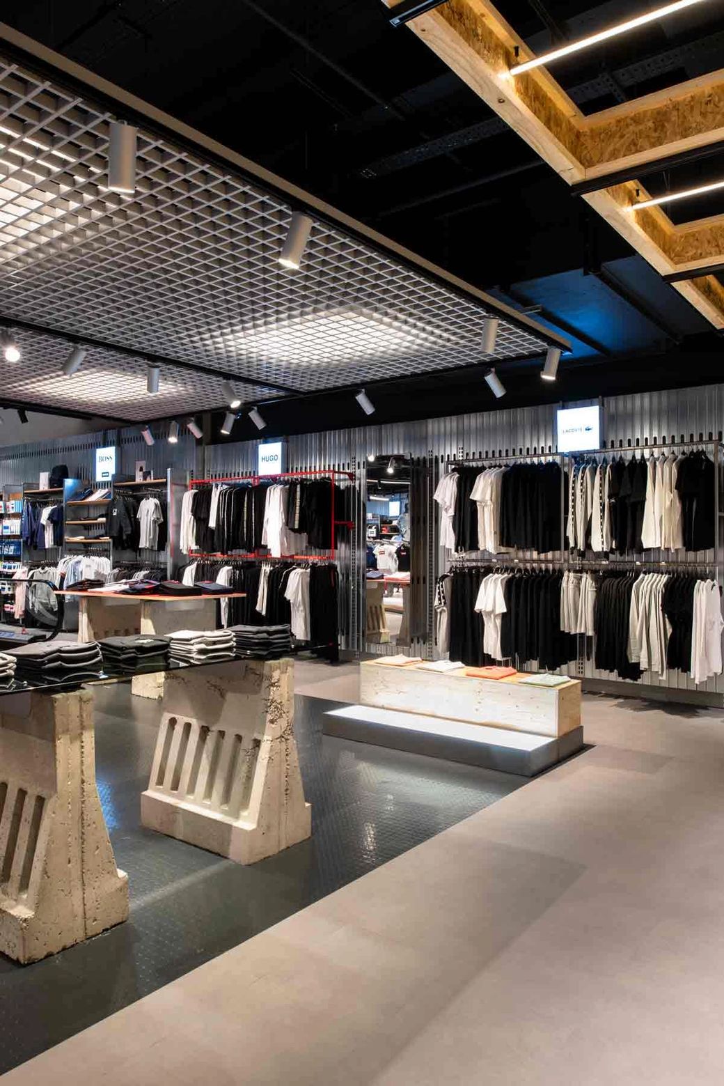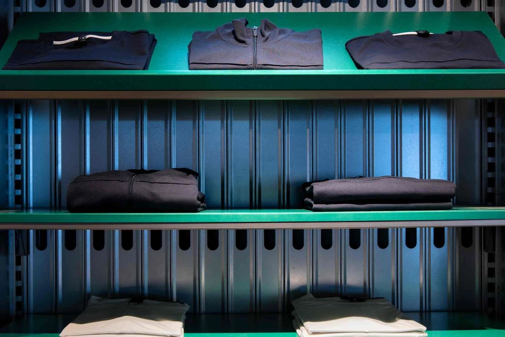 We reduced the density to give more clarity to collections, included a customisation area for bespoke t-shirt design, and space to host music, events and tutorials. Fitting rooms feature charging points and adaptable light settings for the ideal selfie backdrop. Just as we did with our previous work at USC’s Thurrock Street store, we explored the idea of customising utilitarian systems, taking off-the-shelf building supplies and reworking them into bespoke, durable retail kit.