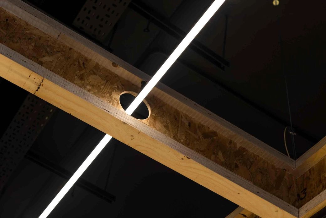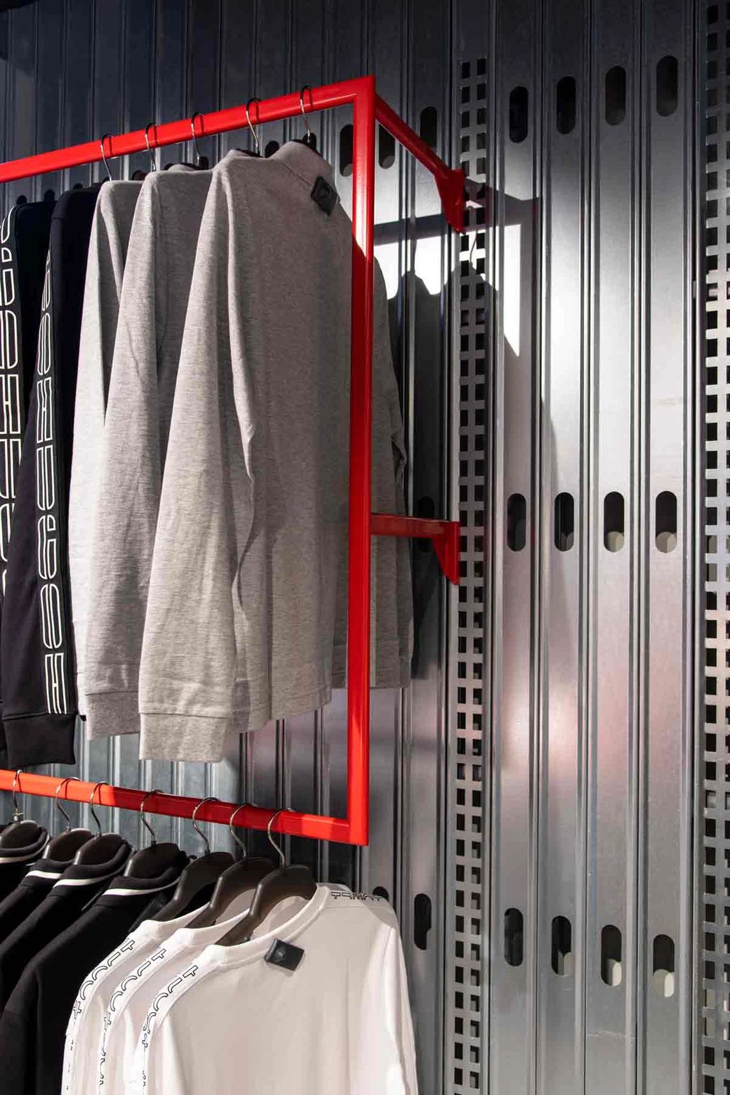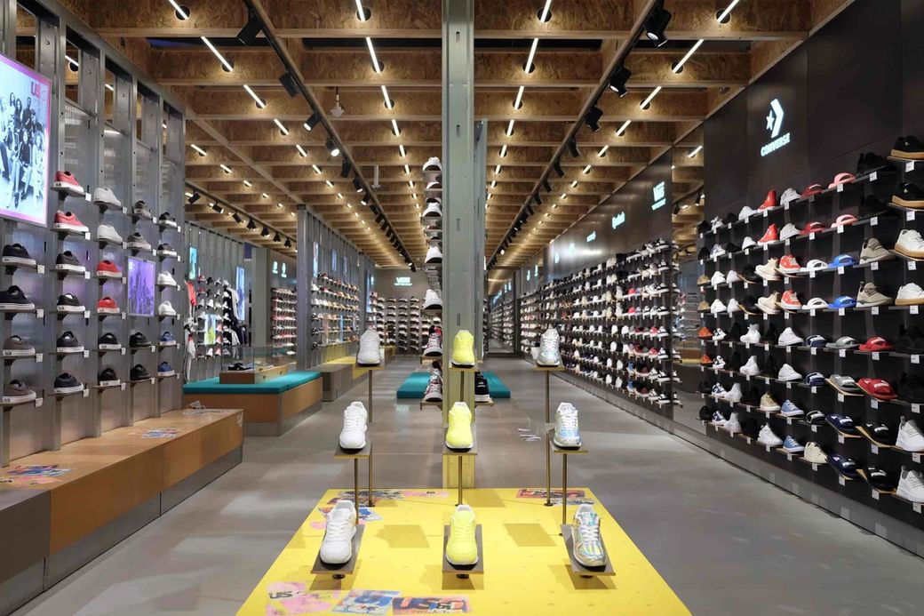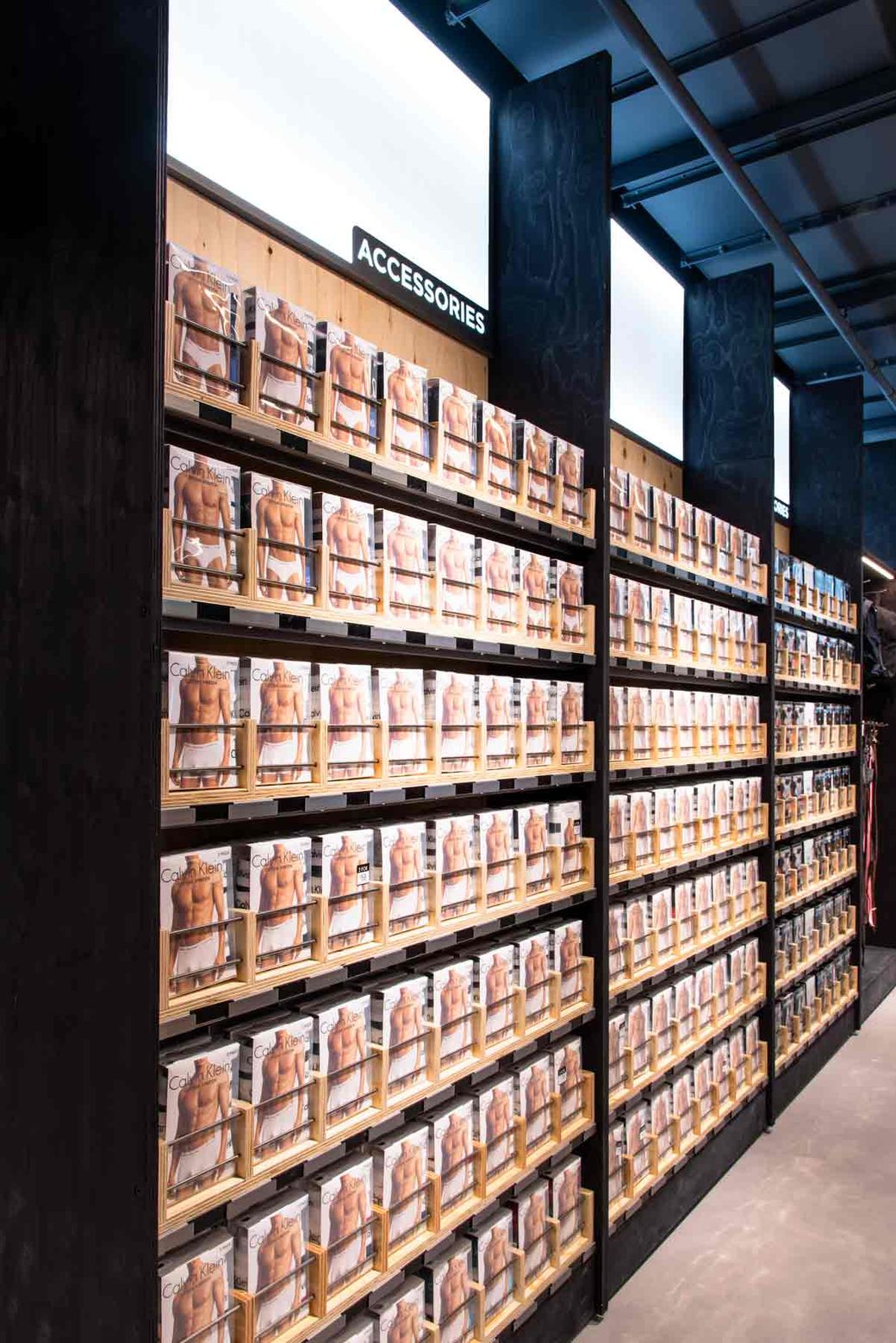 We reduced the density to give more clarity to collections, included a customisation area for bespoke t-shirt design, and space to host music, events and tutorials. Fitting rooms feature charging points and adaptable light settings for the ideal selfie backdrop. Just as we did with our previous work at USC’s Thurrock Street store, we explored the idea of customising utilitarian systems, taking off-the-shelf building supplies and reworking them into bespoke, durable retail kit.