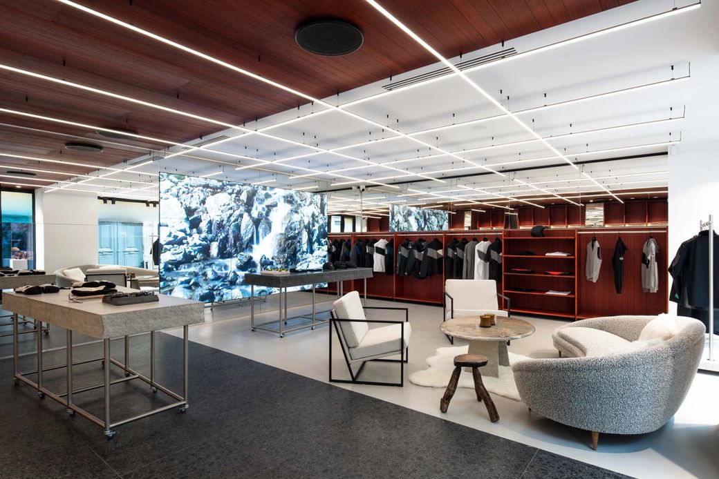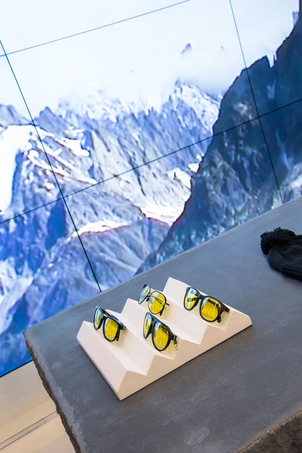 The concept for the new store references alpine landscapes while evoking the comfort and nostalgia of the après-ski experience. Sunglasses are displayed on large stone tables with expressive forms and raw edges that echo mountain terrain, and on backlit glass shelves fitted into a dark timber display wall.