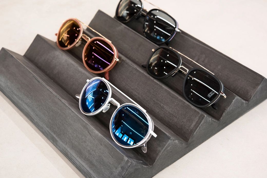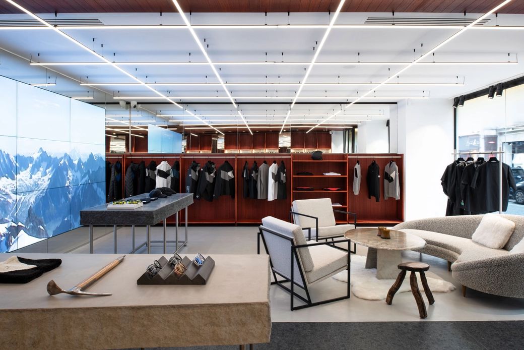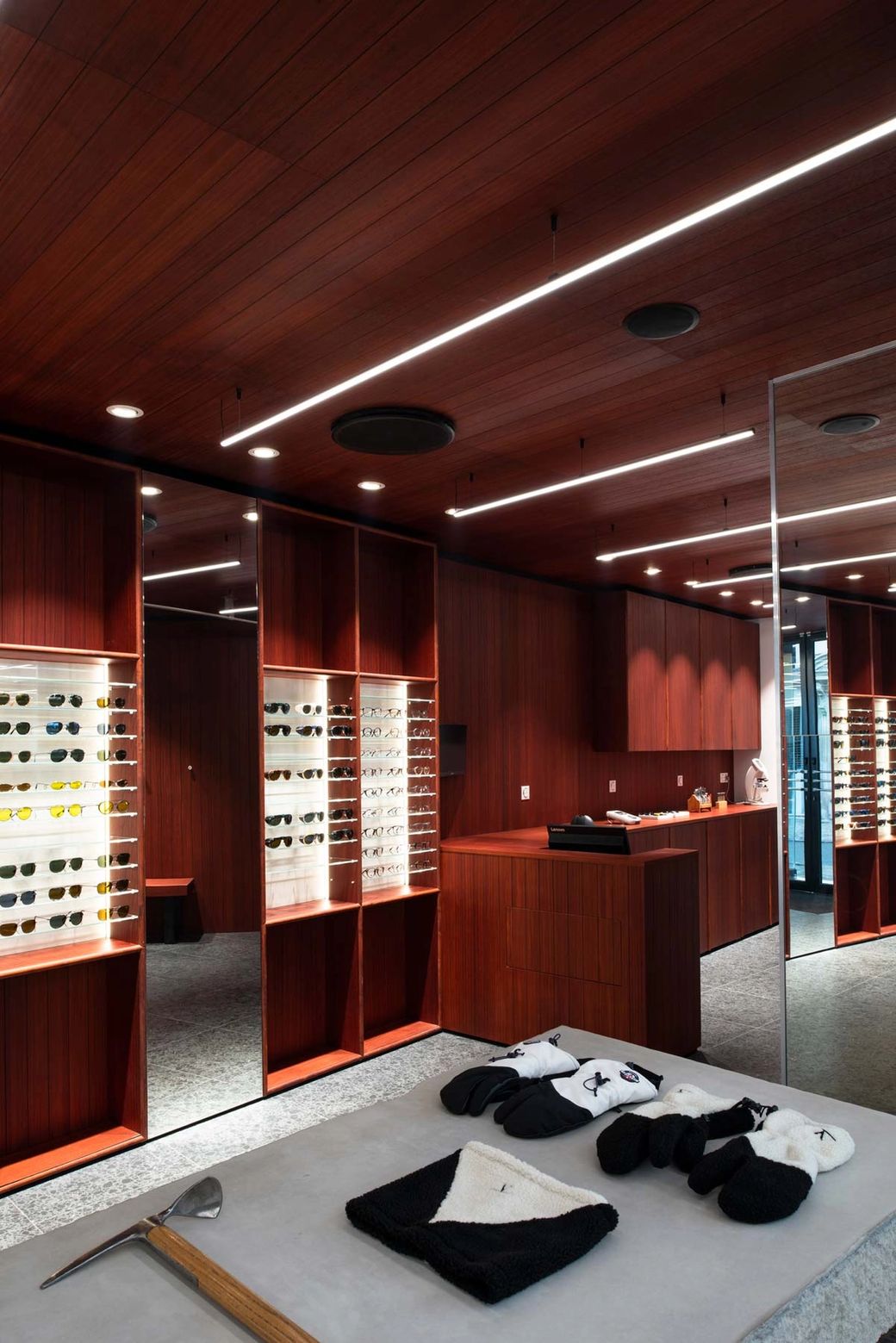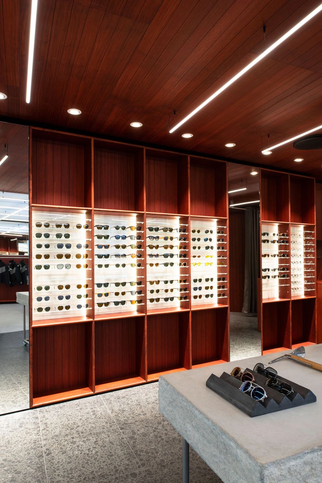 We also selected vintage furniture pieces for the store’s lounge area as a nod to founder Jean Vuarnet’s personal style. An open workshop where customers can have their sunglasses adjusted and repaired reflects Vuarnet’s core values of craft and service.